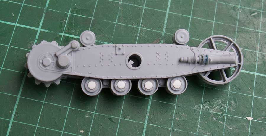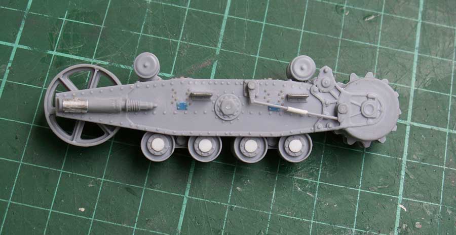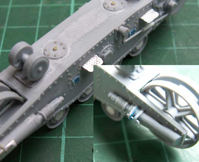 Утяжин на этом этапе значительно меньше, но и устранимы они сложнее. В первую очередь это касается опорных катков, посему детали где шпаклевал, где заменял на пластик. Добавил подножки из фольги с рифлением (бликует и на фото не видно рифления, делалось старым добрым способом - обжимом по напильнику), немного подпили, немного добавил заклепок и детализации. Впереди много нудной и однообразной работы по удалению следов толкателей с тыльной стороны траков и шпаклевание утяжины вверху траков по середине.