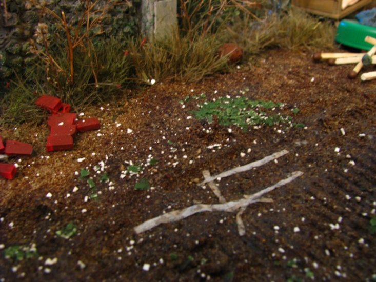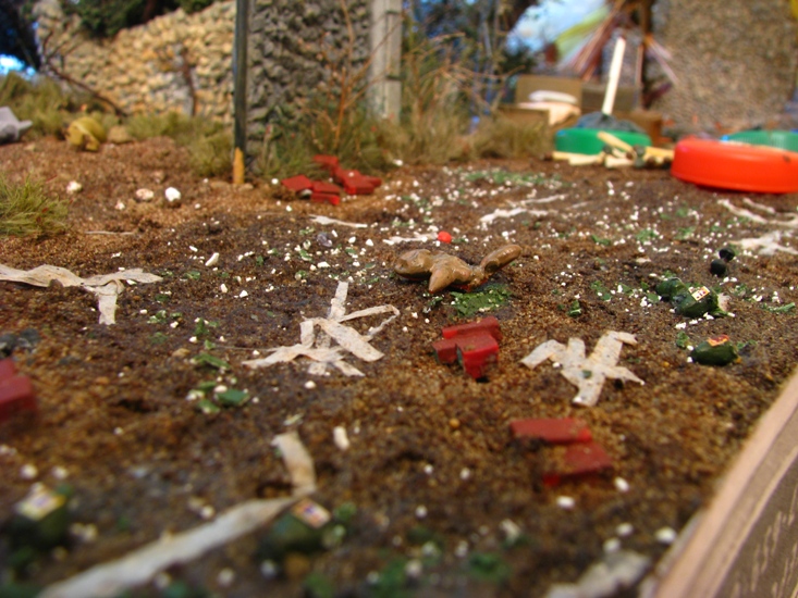 на дороге разместил битые и пустые винные бутылки. осколки стекла.бинты. игрушки. на медведей пока внимания не обращайте они в процессе окраски. бутылки копии бутылки из набора Европа с америкосами. битое стекло яичная скорлупа. бинты туалетная бумага. игрушки вылеплены из пластики.