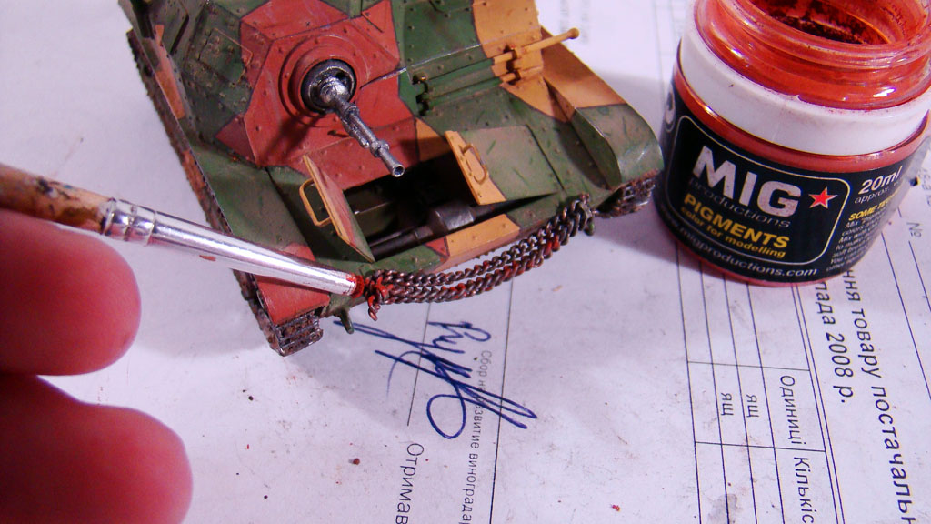 После нанесения грязи,можно даже не дожидаясь пока она засохнет, вся ходовая обильно обрабатывается пигментами от мига P414 Track Brown, а все остальное светлым P232 DRY MUD