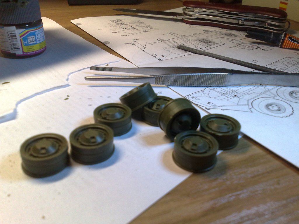 Начал сборку, собираю из коробки, как по инструкции, думал заменить все поручни на проволоку, я понял многие так делают, но в процессе передумал, решил делать с пластмассовыми. В процессе отделения от литника переломал поручней штук 4-5. поэтому проволочку погнуть придется))))) Во время сборки возникло сразу несколько вопросов, которые хотелось бы задать изготовителю! 1. Есть мелкие детали, которые можно отливать сразу, а не приклеивать отдельно (завесы на боковых люках). 2. Приклеить корму стало для меня испытанием, очень не удобно. 3. Ходовая - две крайности. Не проработка деталей - нет торсионов. Есть какие-то стоечки (запчасть под №13, вроде) я такого в настоящем не помню, посмотрю чертежи и документацию, выясню что это. Но пока решил не клеить. Но, а пока вроде все. Завтра доклею, все косяки постараюсь пошпаклевать, пошкурить. мож, если повезет, начну красить. Навесное типа пилы, ящика и бочек решил пока не клеить. Сначала покрашу.