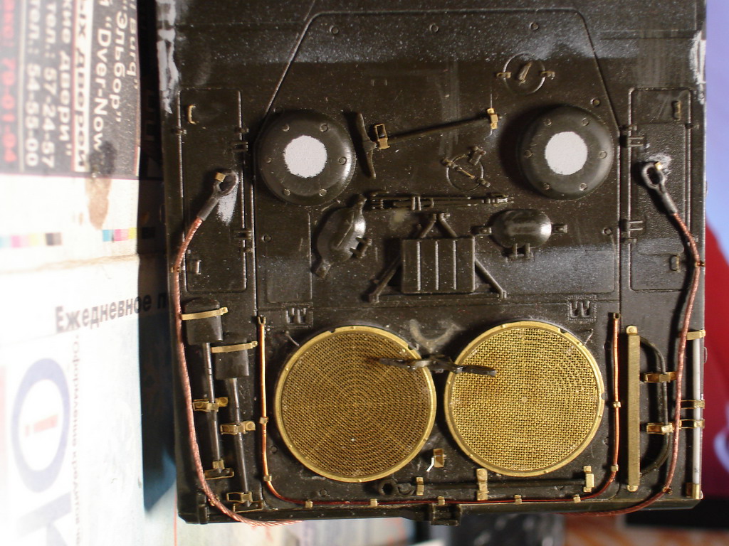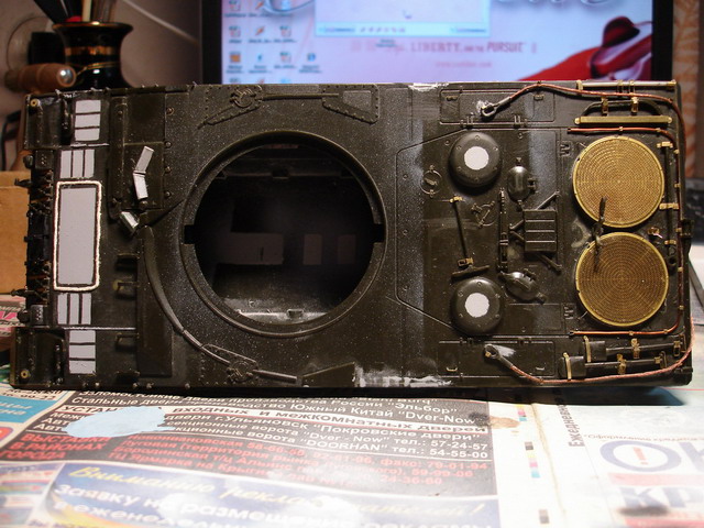 Сделал дымовые гранатометы, корзины, катушку для кабеля, "приварил" демонтажные петли, установил пушку, поручни и по мелочам. Не хватило у меня характера спаять новые корзины (эти немного неверны), в итоге подгонял тамиевское травло под италовский пластик, задние стенки оказались все таки кривоваты, грунтану - посмотрю как это будет выглядеть в монотоне, возможно переделаю. Ну собсно башня практически готова, осталась пара мелкий деталей, с турелью пока не решил что делать. дальше все упирается в засохший колорстоп, перископы нечем замаскировать перед грунтовкой и нанесением антислипа, заказал уже)) Пока идет посылка с колорстопом, тамийским скотчем и кой какими болтиками, некоторые места ещё подшпаклюю да переделаю некоторые швы на корпусе, да и "кошку" пора делать уже под окраску. ^_^