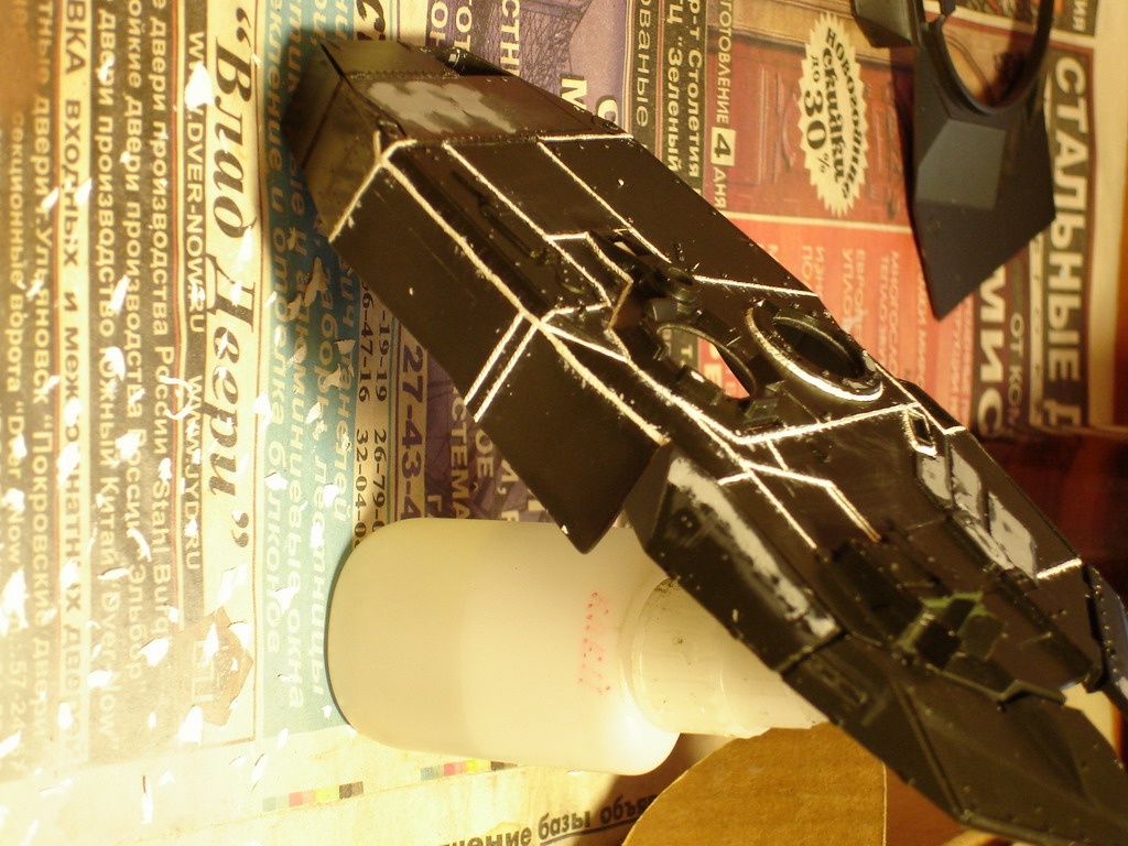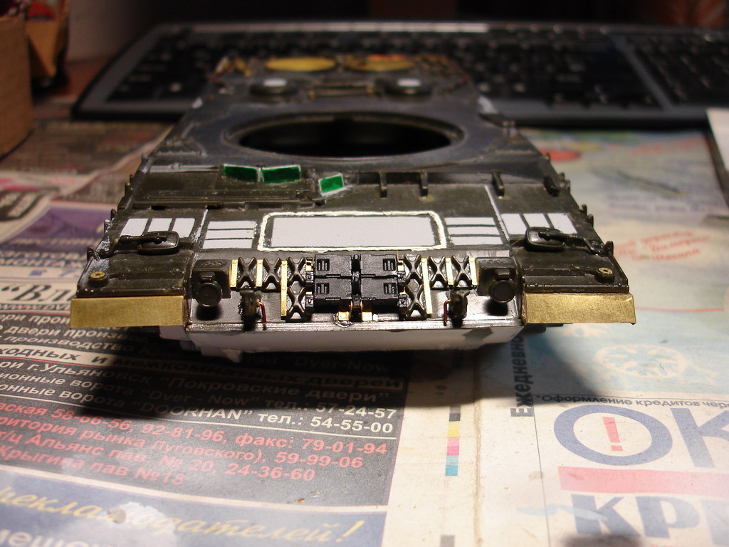 За вечер переделал в очередной раз швы на башне до приемлемого вида, это финальный вариант. На макро повылазили косяки, поправил. Юзал штатив, мировая штука! Куча утяжин замазана и зашкурена, в барбет вставлен раскроеный вафелькой кубик - имтитация радиатора тепловизора.