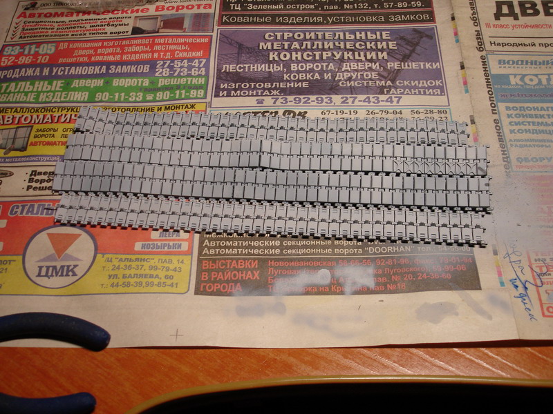 Начинается самое веселое во всей работе над этой моделью - это гусеницы. Фото родного винила на корпусе прилается, он убогий, как оно собственно и должно быть. Ставить эту порнографию я категорически не захотел, потому изыскал наборные траки от АФВ, это перепак HK creations. В наборе все необходимое для сборки 170 обычных и 10 со шпорами траков. детализация отличная, даже есть намек на торцевые выемки на гребнях. Немцы очень любят гусеницы на параллельных пальцах, потому траки между собой соединяются тремя башмаками. ГУсеница сделана правильно, башмаки даны отдельными деталями, а не как у мастерклуба для совестских танков, огибание гусеницей ленивца и зездочки более эстетичное, но сборка существенно усложняется. Вырезание с 10 литников всех деталей, а затем их последующая подготовка - это отдельная песня, ведь каждый башмак нужно привести в божеский вид: убрать швы и зачистить питатели, а он ещё маленький. Та ещё работенка, чем я занимаюсь уже второй вечер... Пластик очень твердый и прочный, но при неправильной нагрузке с удовольствием ломается, с десяток внешних башмаков были сломаны при отделении от литника. но они все пойдут на закрытую фальшбортами часть, если целых не хватит. Если верить схеме и фото нужно 84-85 траков на один борт, так что если не учитывать траки со шпорами, то их тютелька в тютельку, а ведь нужны ещё два трака и несколько башмаков в ЗИП танка. Пока суть да дело, вспыло следующее, эти гусеницы не ложатся на италоревелловскую звездочку, ширина трака примерно такая же же как на виниле, но внешник башмак длинне и просто не входит до конца между зубьями. За это пострадают зубья, их придется стачивать, потому что на башмаке пилить нечего, он и так миниатюрный. Пока гусеница в процессе...