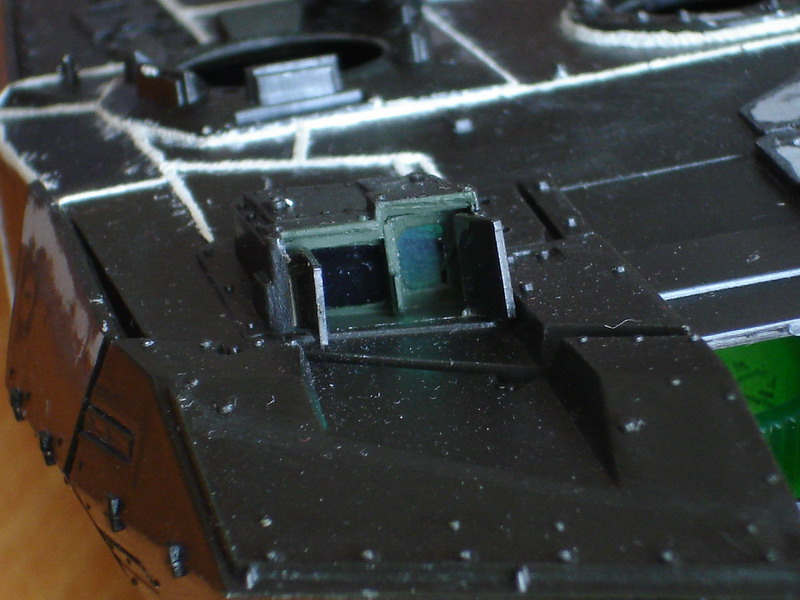 В общем, для тех кто в меня верил и не очень, работа продолжается... Два дня поколупал, оптику и люки закончил, по второму разу все утяжины, вывел надфилем и шкуркой скругления навесной брони. Перед этим были многочисленные творческие поиски в плане оптики, в итоге я остановился на прозрачном тонком полистироле с привареными у нему слабым утюгом фантиком от корейских конфет, необходимый кусочек вырезается, приклеивается суперклеем на покрашеный (чем лучше - пока не определился) участок, после футуры смотрится чудесно...