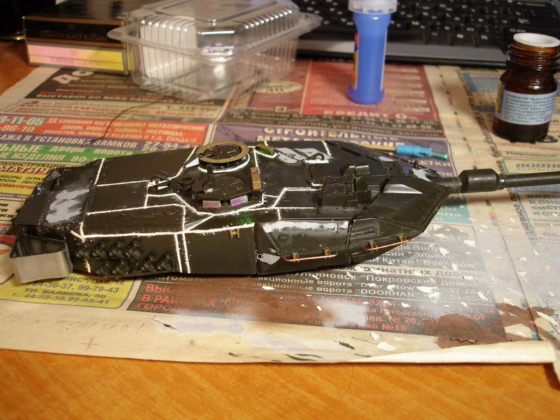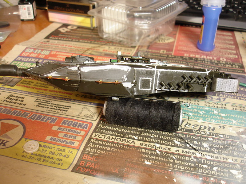Вобщем, не то что бы запил, но рfбота изрядно затянулась, ввиду занятости, ленности и прочих отвлекающих факторов, начал я этот современный панцер ковырять еще до нового года. Так получилось, что по не знанию купил самое учебный сет травла на этот танк и самый примитивный пластик, перепакованый с незначительными доработками Ревеллом италовский кит. Значит, помимо ревелловского пластика, было куплено эдиковское травло 35 101, возможно даже его пиратская копия, составные сетки на подачу системы охлаждения от вояджера, тамиевские корзины на башню, наборные гусеницы от AFV, позже о каждом кусочке афтера я расскажу подробней. Значит, начиналось всё красиво и легко, геометрия отлично легла в чертеж из конкордовской книжицы, на сим удовольствие закончилось. Чем больше я углублялся в матчасть, тем сильней мне хотелось выкинуть это ИЗДЕЛИЕ в окно. Если основная габаритка вполне нормальная, то пристутсвуют многочисленные косяки по мелочёвке. Итал, не мудрствуя лукаво, слегка изменил корпус от А4 под А5, эти изменения видны швами на корпусе, исправлено не всё. Хоббибосс и Тамия тоже не идеал, но по-лучше будут по части копийности. Спереди я весь антислип спилил и надул новый, а сзади это куда более затруднительно, потому трогать его не стал, оставил как есть, большая часть всё равно закрыта башней... На днях возверну фотик, отфотаю корпус, начал работу над башней. НУ и фото условного прототипа, я решил масксеть не делать, ибо она закроет очень много деталировки, а мне это на фик не надо...