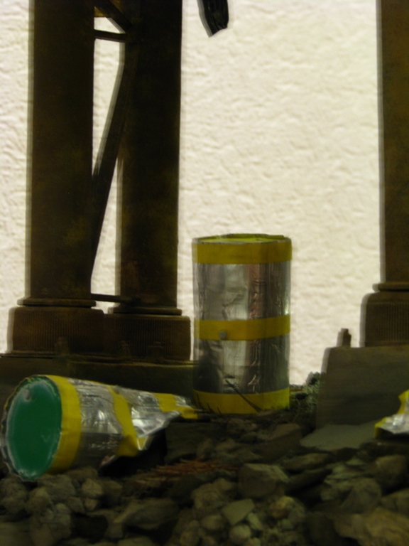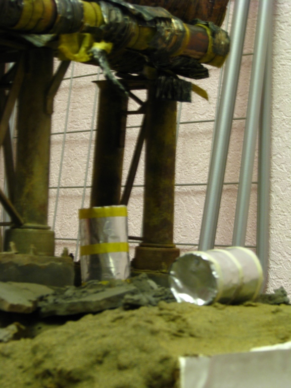 итак, сделал 4 бочки (крышки от газировки, фольга от гофротрубы вентиляции, скотч тамиевский.)окончательно загрунтовал пенопластовое основание песок на ПВА.