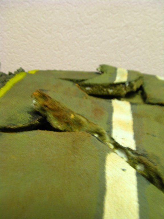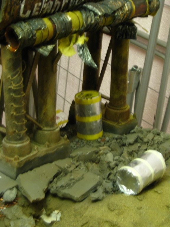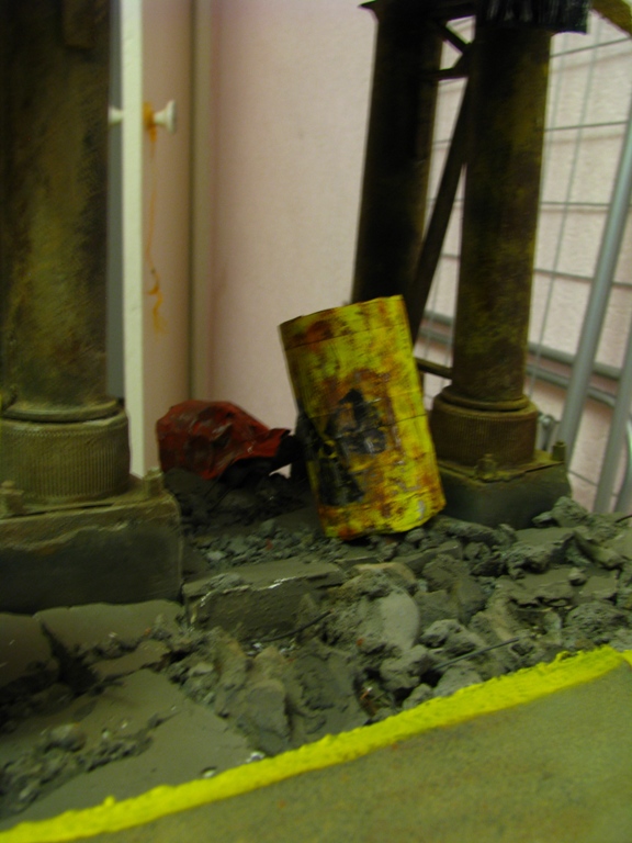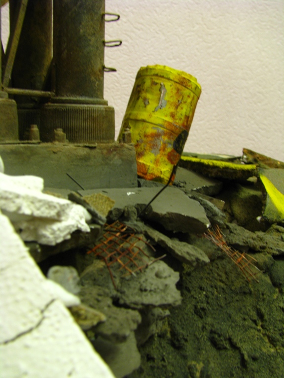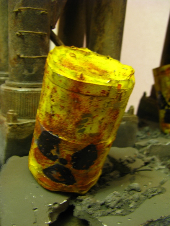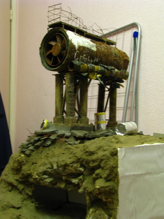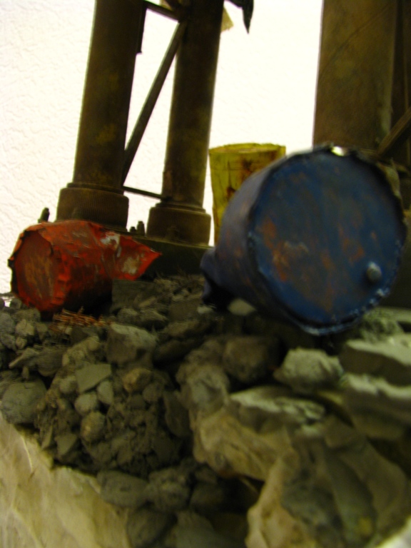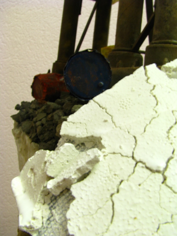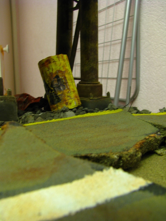 итак, сделал дополнительную трубу- баллончик из-под крема для бритья. бочки самодельные. асфальт- наждачка нулевка на пенопласте. часть бетонной плиты неокрашенная пусть сохнет.