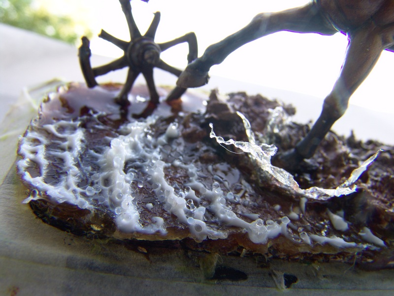 Решено было взять прозрачную плёнку от сигарет.Вырезать всплески по вкусу,ну или как видит художник.Закрепил получившееся вокруг копыта лошади (коня).Получилась некая опалубка.В которую не попадёт эпоксидка.