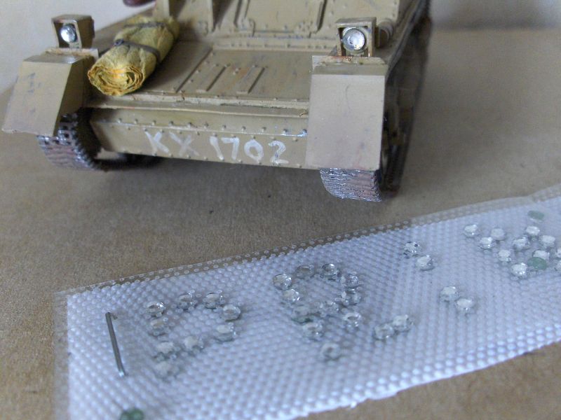 Вот изготовляю фары. Конструкция их у танка играет мне на руку. Здесь не обязательно сверлить лунки под дорогие и довольно редкие (хотя и отличные) фары "Эльфа". Купим полоску одежных стразиков, какими пишут на женских джинсах всякие глупости. Удобнее взять целую надпись, а то один отдельный стразик у нас 2 рубля.