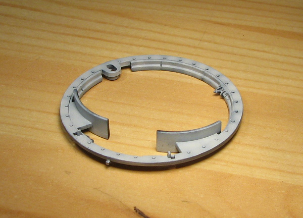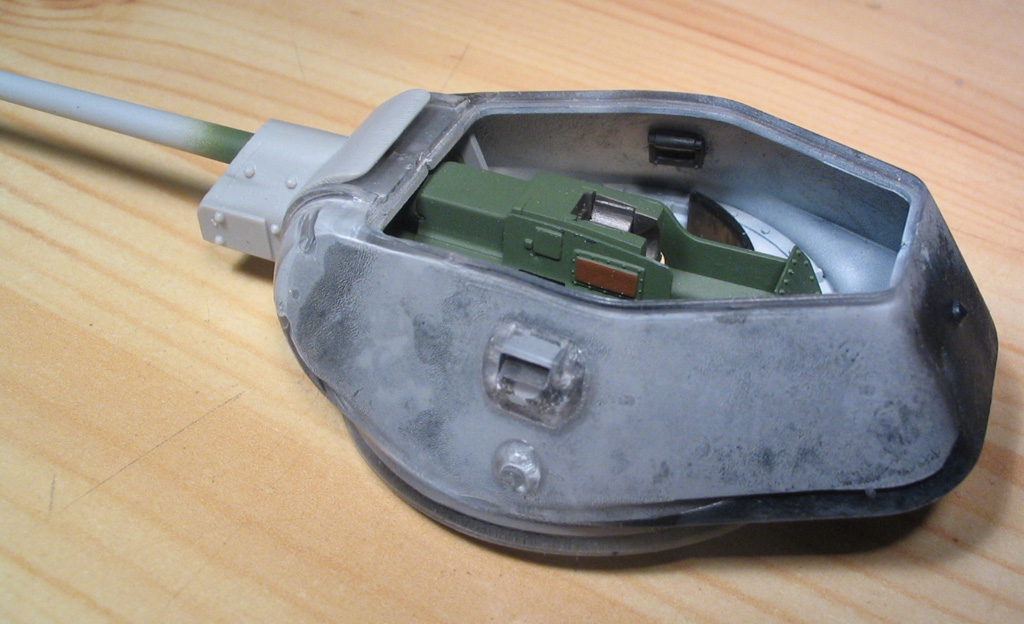 Склеил башню. На фото заметна имитация литья внутри.Тут я опять влип. Нужно было смотровой прибор устанавливать до склейки двух половинок. Поскольку он даётся вместе с куском борта, естетственно теперь он полностью не входит в положенное место, и как его теперь подгонять?