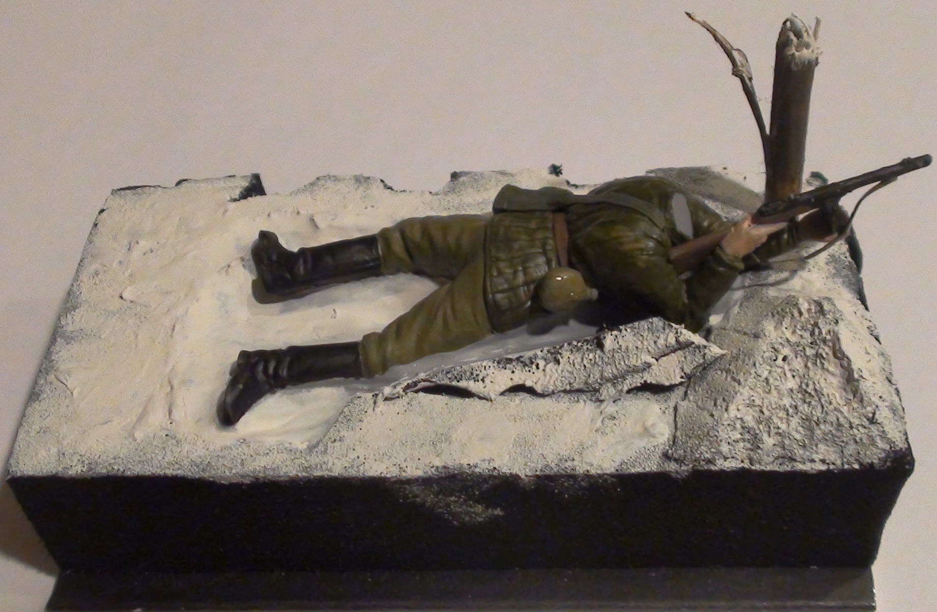 Впервые делаю что-то похожее на виньетку. Солдат из набора" Звезды" (истребители танков с собаками). Валенки заменены на сапоги. Основание - переделанное из коробки для сотового телефона, нанесена шпатлевка и немного вдавлена в нее фигурка.