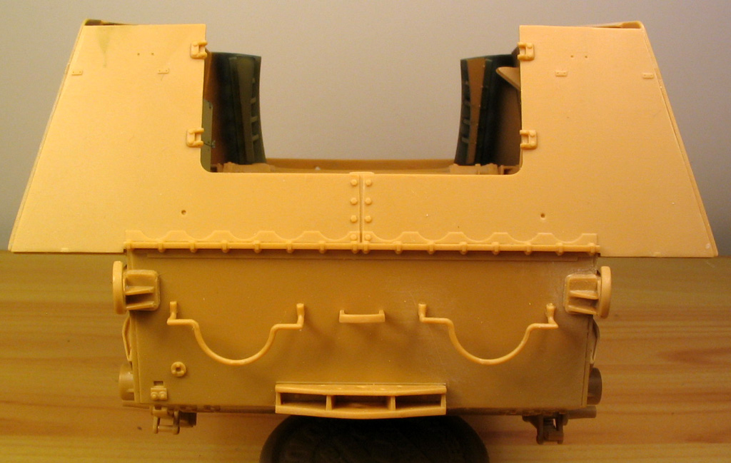 5. Сама крыша над двигателем у Драгона дана одной деталью вместе с воздуховодными карманами и поетому сверху все ОК, а вот со стороны боевого отделения это упрощение уже заметно.