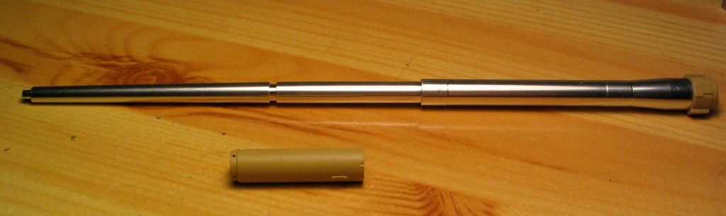 Орудие досталось этому набору от противотанковой пушки выпущенной в 2005 году, так что здесь уже есть и облойчик и стыковка не ахти и килограммы шпаклёвки нужны. Сам ствол дается точенным причём одной деталью на вся длину, что очень хорошо, но производитель решил ради двух планок и парочки гаек дать утолщение на стволе в том месте где тонкая часть ствола соединяется с толстой из пластика. Две пластиковые детали склеиваются вместе и одеваются на ствол. Я бы предпочёл эту деталь выточенной сразу, а эти планки я бы сделал сам, ствол бы был красивее.