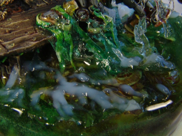 хочется обратить внимание на то сколько лака добавлять в эпоксидку.Если у вас стоит задача изобразить водоем в нескольких квадратных сантиметров,то достаточно капельки на кончике зубочистки,если рассмотреть мои пример то этого даже много.Когда глубина небольшая то ошибка в соотношении эпоксидки и лаков не так заметна но, если глубина пару сантиметров,эта может привести к катастрофе.Материал слишком крепкий и переделке не подлежит!!!Проще после заливки оценить результат и если что-то не так, начать операцию с новым составам.