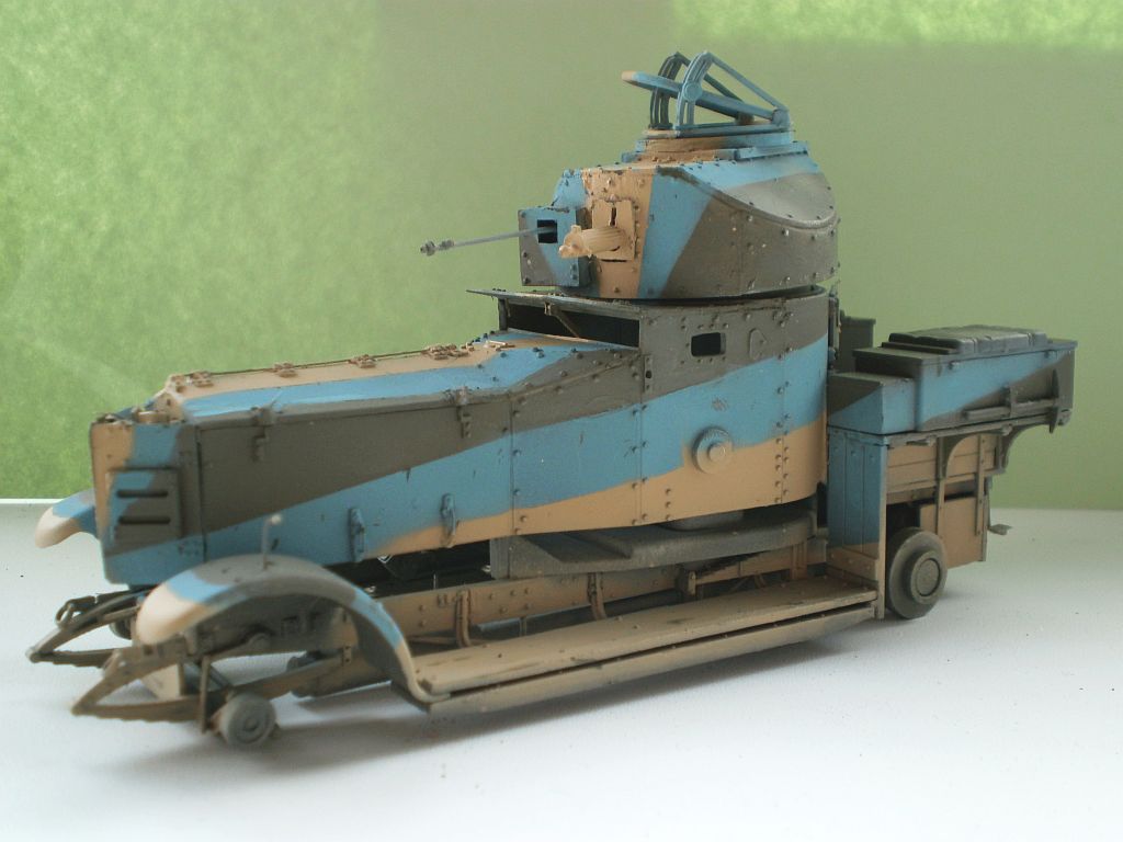 Так что ярко-зеленый на рисунке с коробки - едва ли реален. Скорее всего - "земляные" БА (такой вариант окраски есть в инструкции на 20-е гг, только там он назван странным и непонятным "зеленым хаки". Впрочем, цвета в инструкции жутко напутаны - там аж три... серебристых под разными буквами. Спешка, дорогой "Роден", нужна "тильки при ловле блох да при упреждающем ядерном ударе". Желто-серебристый камуфляж БА, каково?!), были наскоро покрашены песочным и серо-голубым "линейным" камуфляжем. Вот тогда все становится на свои места, даже темные сколы на песочных и голубых полосах башни и то, что песочный - выглядит более свежим и целым на этом несчастном фото в первом посте.