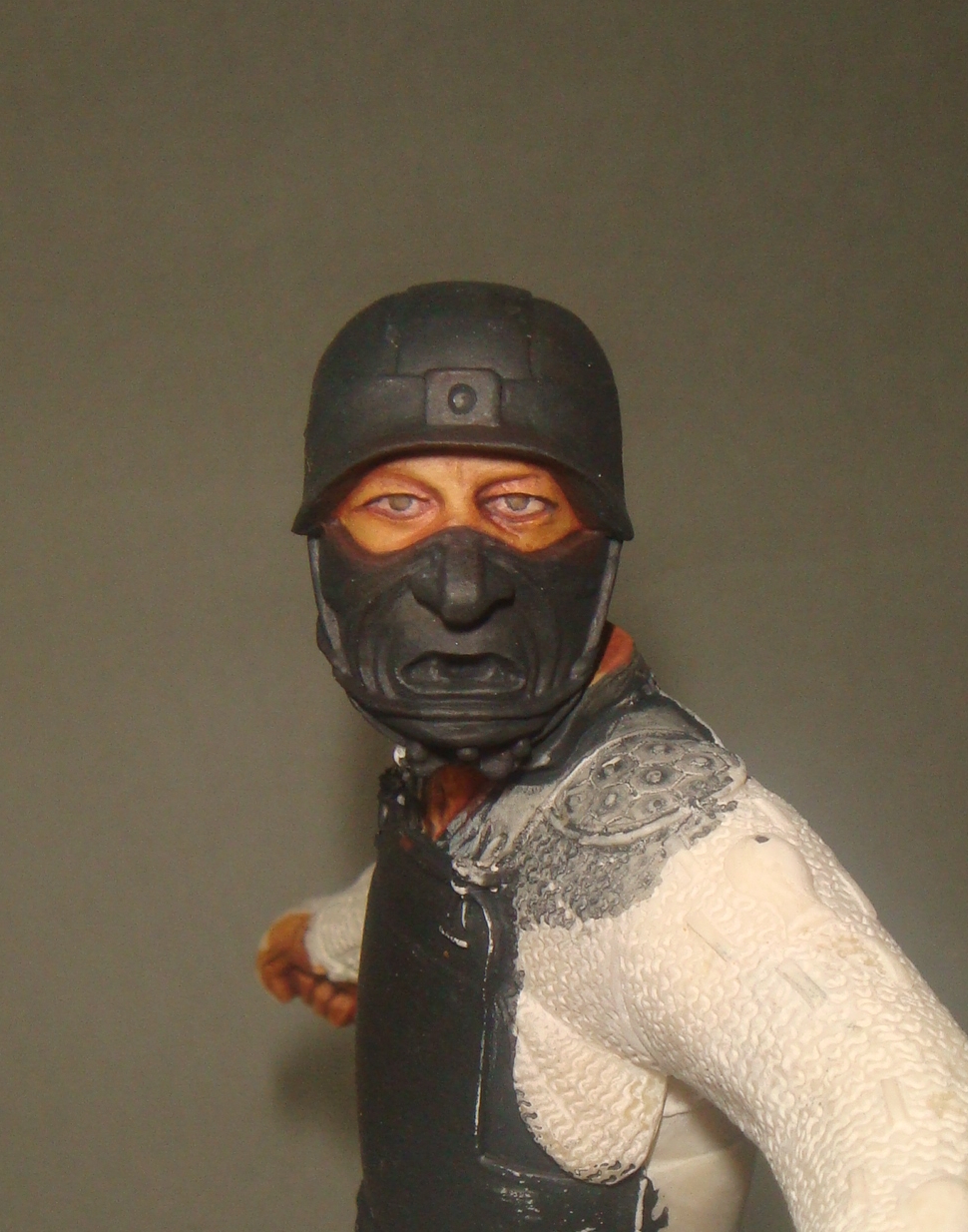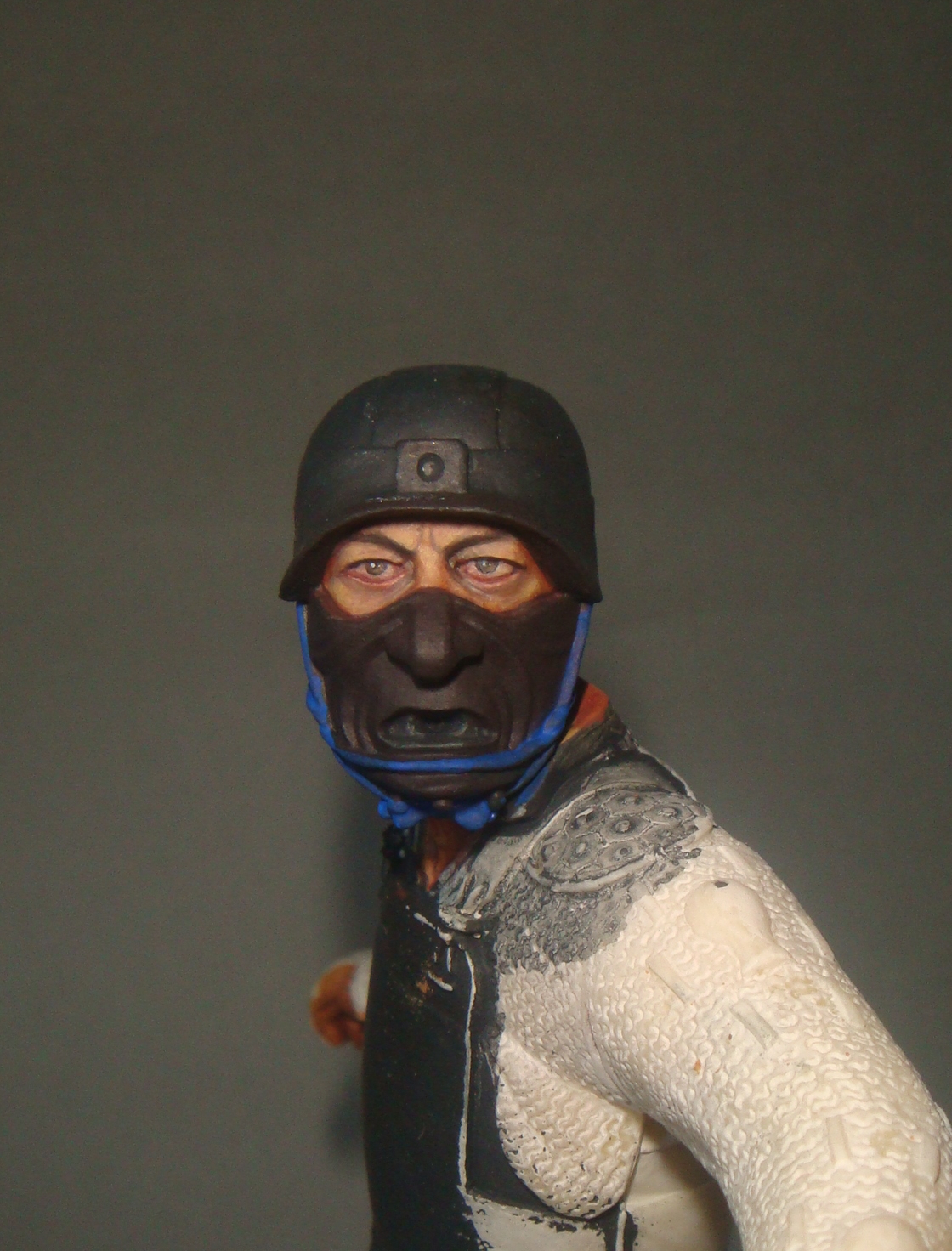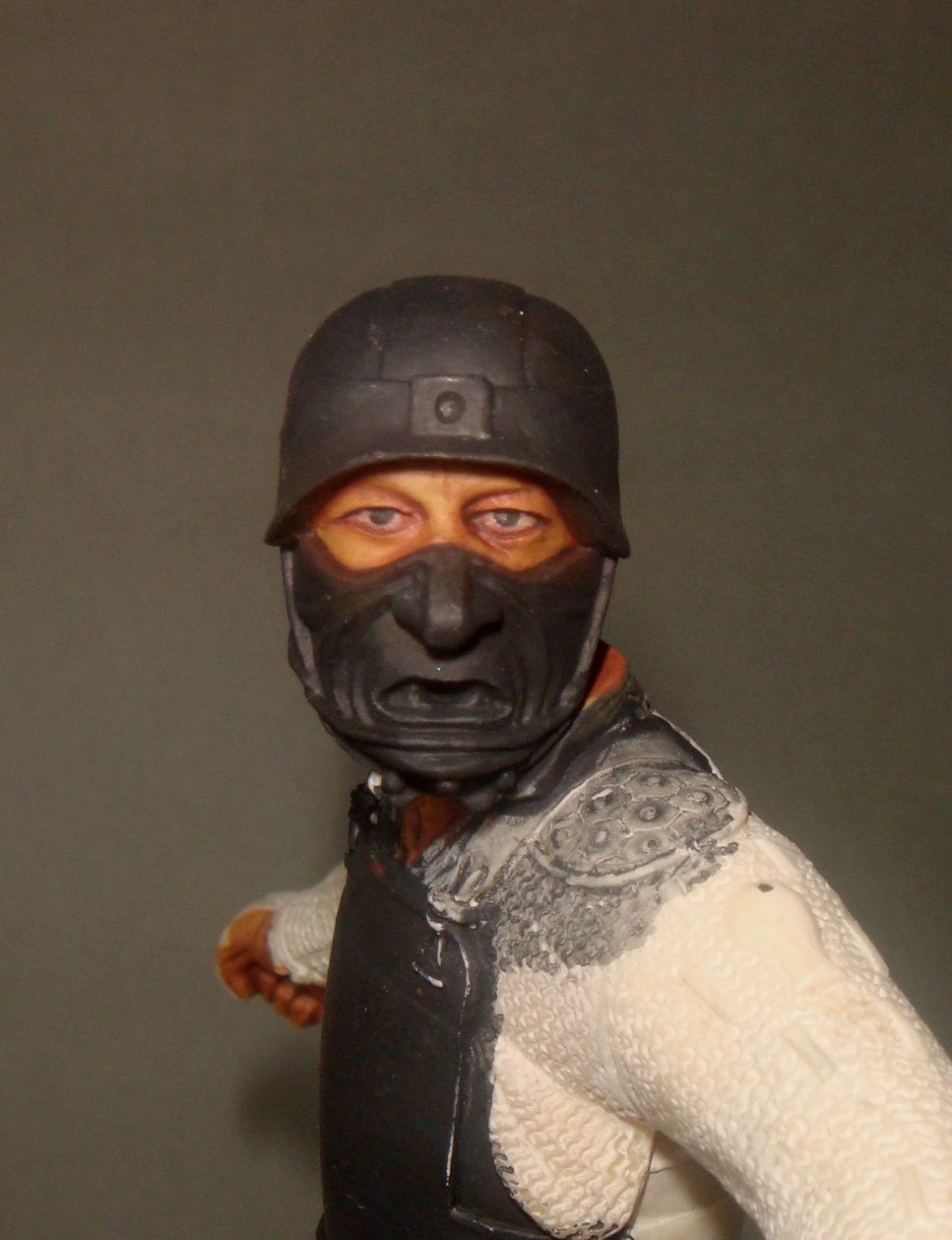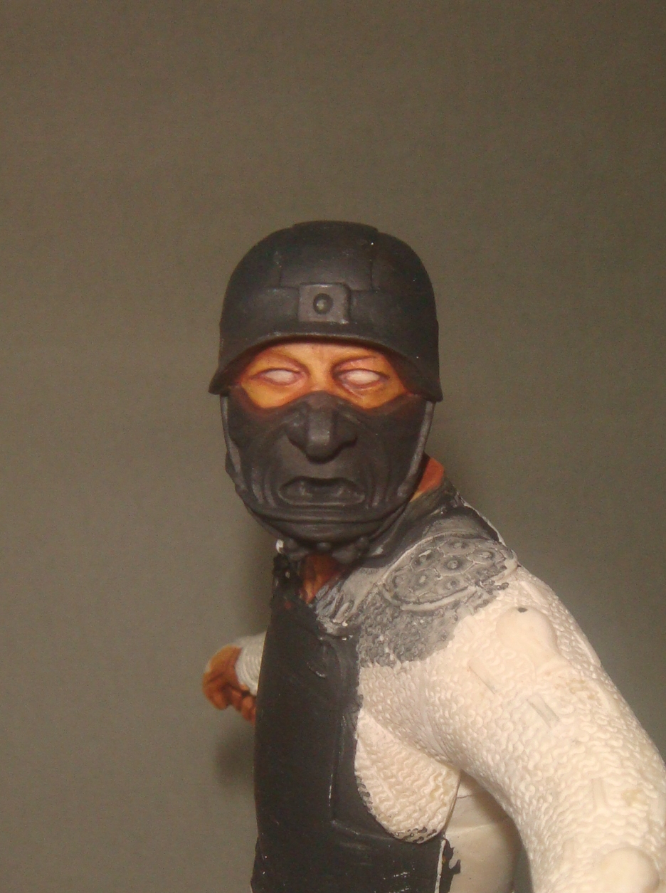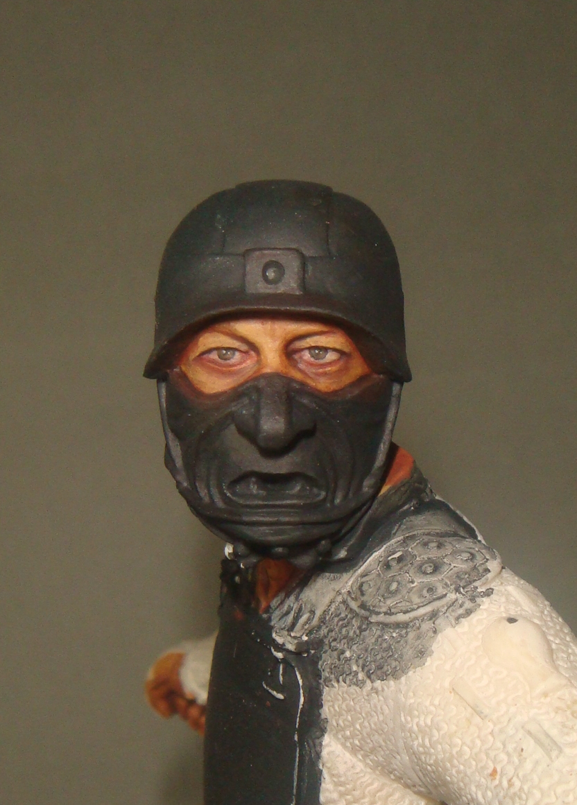 Итак.Во-первых я нанес базовый телесный цвет (фото 1) Намешан он из Brown Sand от Vallejo и желтого цвета от Хома.Затем (предпочитаю начинать с теней) я наношу в самые глубокие складки,впадины и тд. смесь базового цвета с добавлением небольшого количества Cad.Red и Кирпичного от Звезда.Делаю буквально 2-3 лессировки,каждый мазок растушевуется влажной кистью (фото 2) Потом делаю тень более активной добавляя в базовую смесь еще большее ко-во вышеназванных красок (фото 3) - опять-таки следуют 2-3 захода лессировок с растушевками(на данном этапе плавностью переходов я не сильно озабочен,мне важно увидеть рельеф и общую свето-теневую игру)