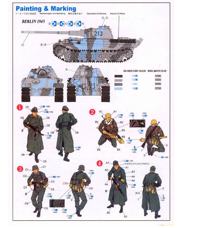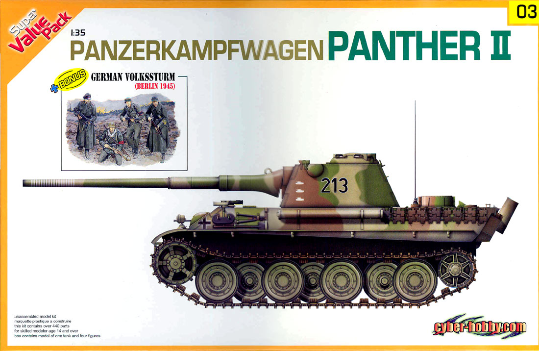 Предлагаю вашему вниманию мой первый блог по постройке танка Panzerkampfwagen Panther II от Cyber-hobby в масштабе 1/35. Данный набор является переизданием старого набора от Dragon с различными дополнениями: шанцевым инструментом из наборов Smart kit, фигурками немецких ополченцев (Volkssturm)из набора Dragon №6020 и 2 платами ФТД, на одной из которых размещены решётки воздухопроводов и очками к одному из ополченцев. В остальном же это старый набор от Dragon, тем не менее пресс-формы износились незначительно, вследствие чего детали отлиты достаточно неплохо. Однако, если сравнивать этот набор с современным Dragon-ом, то он не выдержит никакой критики. Альтернативы данному набору нет, и если кто-то пожелает собрать модель из коробки, ему нужно будет вспоминать многие свои модельные навыки, поскольку тут есть что переделывать, даже по мелочам.