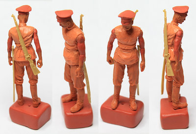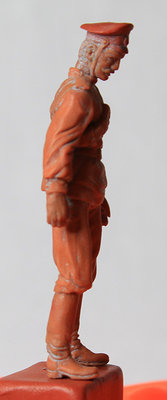 Уважаемые коллеги, спасибо за оценки и внимание к моему скромному труду дилетанта. Сапоги и шаровары закончил. Положение ног пришлось поправить. Слишком кривая была левая нога: не иначе – травма. Добавил объёма торсу. Денис, спасибо за поддержку! Завала фигурки назад-вперёд вроде-бы нет. Посмотрим. Сформировал основные складки (прикидочно), обвесил фигурку временным оружием. Само-собой маузер и точёную из литника временную шашку, являющиеся сейчас габаритно-массовыми макетами, заменю в дальнейшем. После обвеса разметил снаряжение. Для разметки всегда пользуюсь нитками. Так у меня получается точнее. Нитку протягиваю от точки до точки, натягиваю – готово: след ремешка отпечатан. Заготовка гимнастёрки готова, теперь снова: работать, работать…
