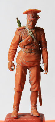 Продолжаем. Выходные – время внука, однако казак, вроде-бы, готов. Шашка не закреплена, ремешок, соответственно, тоже. С оружием морока. Чужое брать не хочу, пытаюсь сделать своё. Проблемы с выбором материала решались, как всегда, методом проб и ошибок. Начал с простого – с шашки. Первая была временной из литника. Вторую слепил из Fimo. Неудача. Материал слишком хрупок. При посадке по месту сломал несколько раз. Попробовал сваять из Cernit. Снова незачёт. Резиновость материала не дала работать с мелкими деталями. Остановился на смеси Fimo-Cernit 1:1. Результат удовлетворил. Шашка получилась в меру гибкой. Теперь вожусь с второй версией карабина Мосина обр. 1907 г. Последний из указанных материалов результата из-за моей криворукости должного не дал. Пробую сделать из зелёнки. Если долго мучиться… Всё равно получится!...