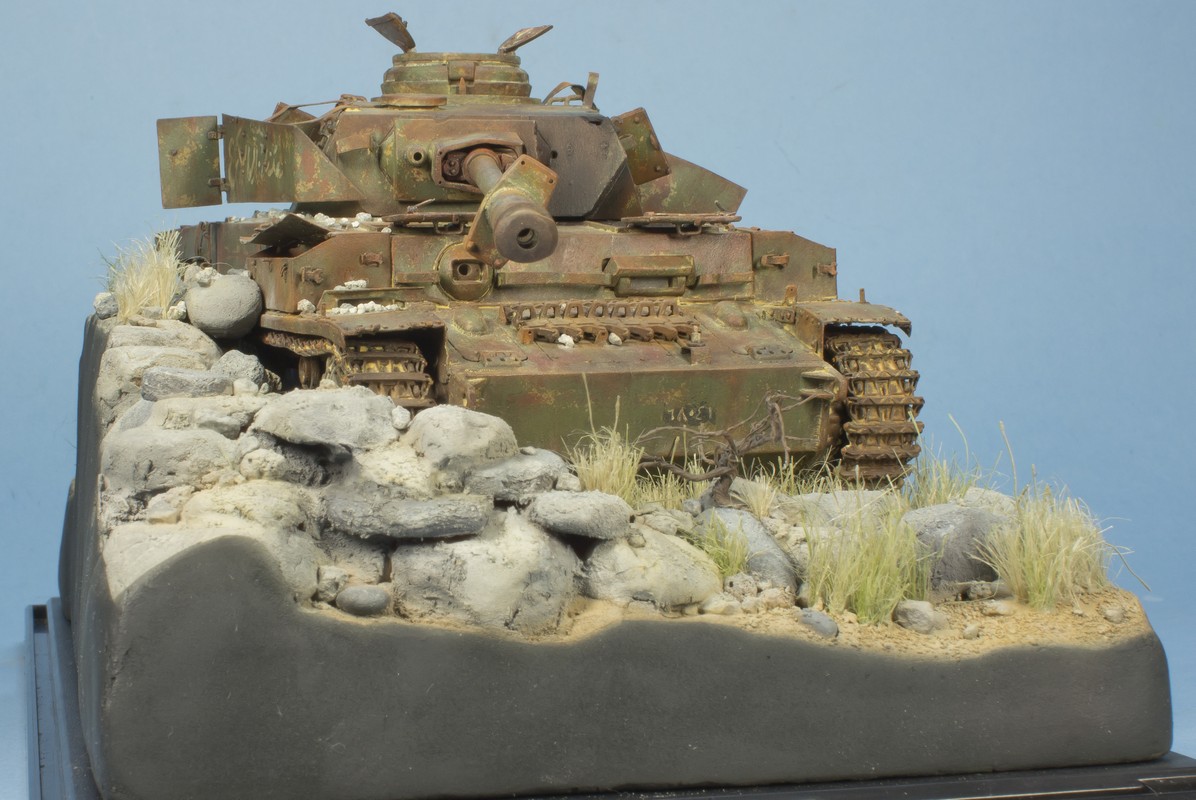 Точно не китайца и точно не старого солдата (немца, я правильно понял?). Танк делался на 70-е годы, когда на нем еще была зеленая окраска. А туристы там появились относительно недавно - это ведь до сих пор милитаризованная зона. Там и минные поля есть и современные укрепрайоны и войска... Т.е. китаец - это 2000-е, а сейчас эти танки куда более ржавые. Из окраски остался в основном грунт. Это про китайца. Про немца - еще более спорно появление солдата вермахта именно в Израиле с целью посетить танк на котором воевал. Да и старые они нынче – как и наши. Если и делать фигурку - то военный корреспондент или израильские солдаты, проезжавшие мимо и подошедшие посмотреть на диковинку.