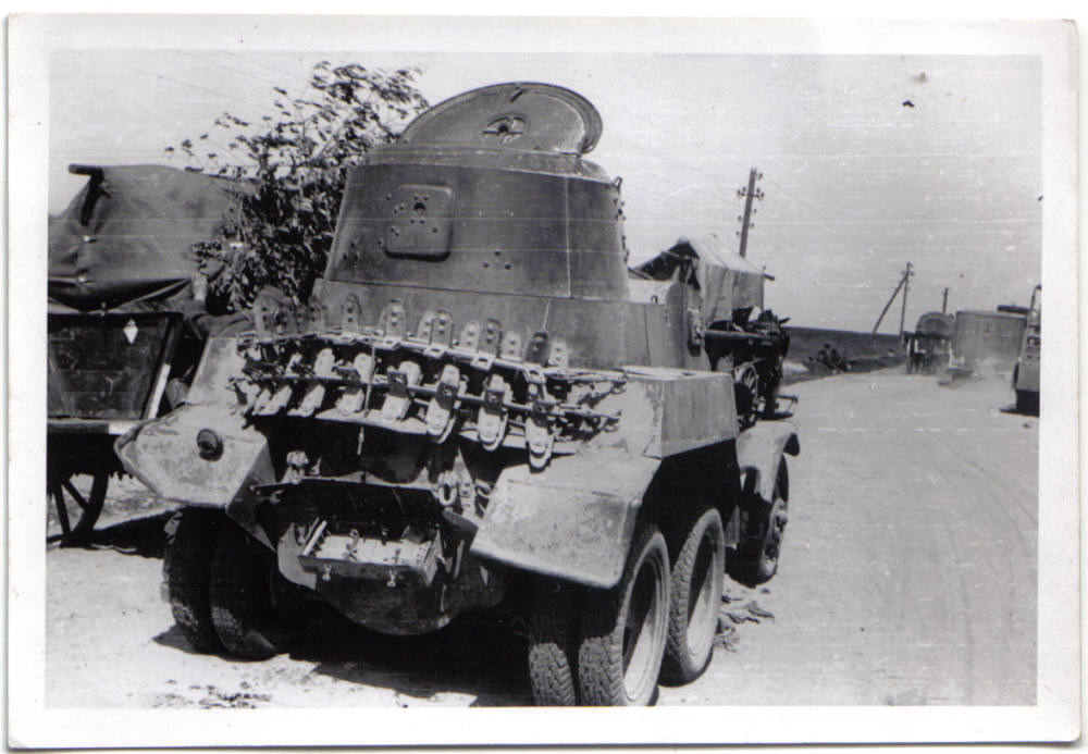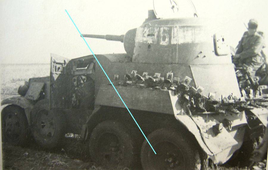 Полосу я делал не просто так, а по фотографиям (ниже). Это фото из под Умани августа 41 и полоса достаточно стерта. Думаю, что это тактическое обозначение с предвоенных учений и наносилось смываемыми белилами.