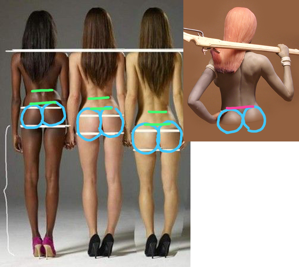 А чтобы не было разночтений на фото обвел синим ягодицы, зеленым линию талии и красным полное отсутствие крестцового отдела позвоночника: