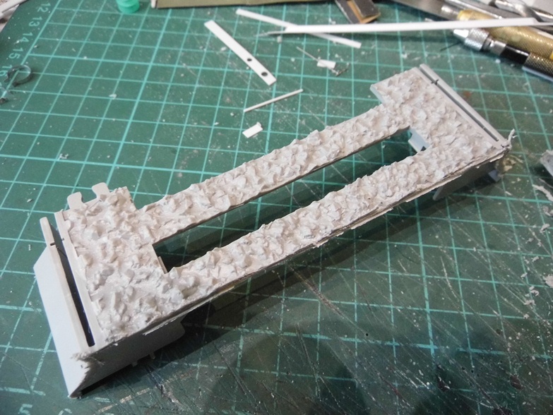 Каждый набор имеет оконечные детали, у которых шпалы можно закрепить только до середины. Пришлось отпилить и использовать с промежутками. Правда все, что ни делается - все к лучшему. На диораме буду создавать покилометровый запас. Нужно было бы выпилить места для шпал, на которые потом ложат рельсы, а здесь уже все готово...