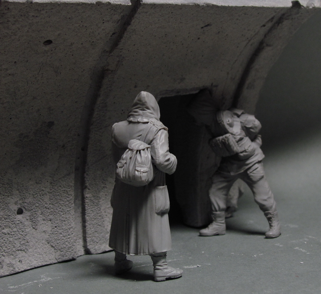Работы еще много. Прорезать намеченный дверной проем. Изготовить дверь, как в бункерах. Будет она приоткрыта, сталкер заглядывает. Проводка кабелей вдоль стены. Всяческий мусор. Лампы на стенах. Пол туннеля. Подставка.