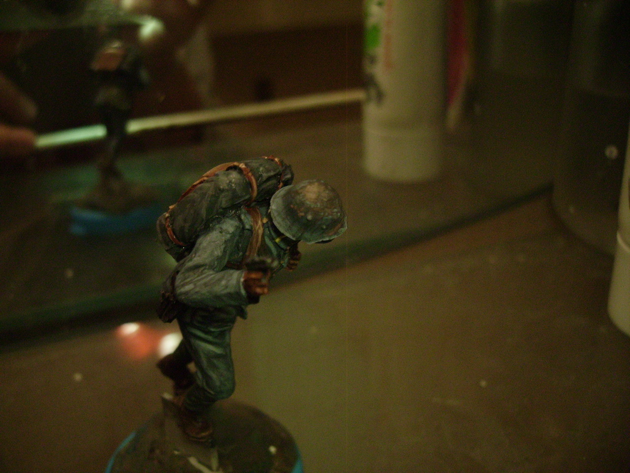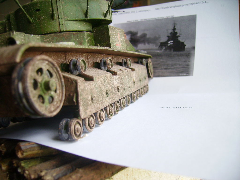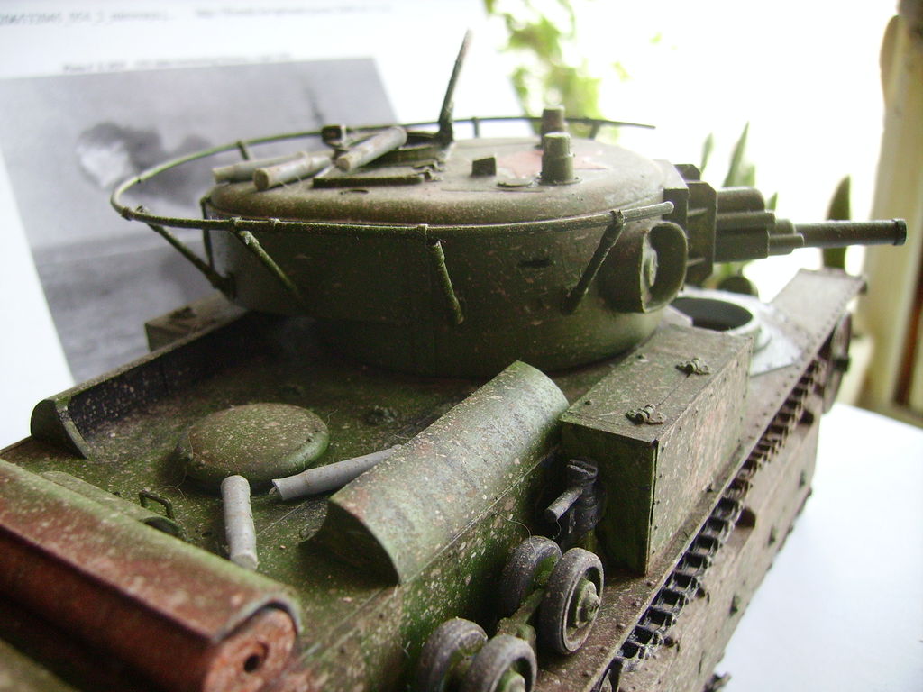 . А теперь обратная сторона медали - заляпанный грязью танк по самую макушку башни - нонсенс. особенно такая здоровенная и не особо скоростная махина как Т-28. Максимум - чуть-чуть боковые поверхности над крыльями и защита ходовой. Всё, что выше подвержено воздействию пыли. А у вас получилось, что танкисты загнали танк в болото, видимо, зампотех добрый в части, не всегда мыть машину заставляет:) Удачи