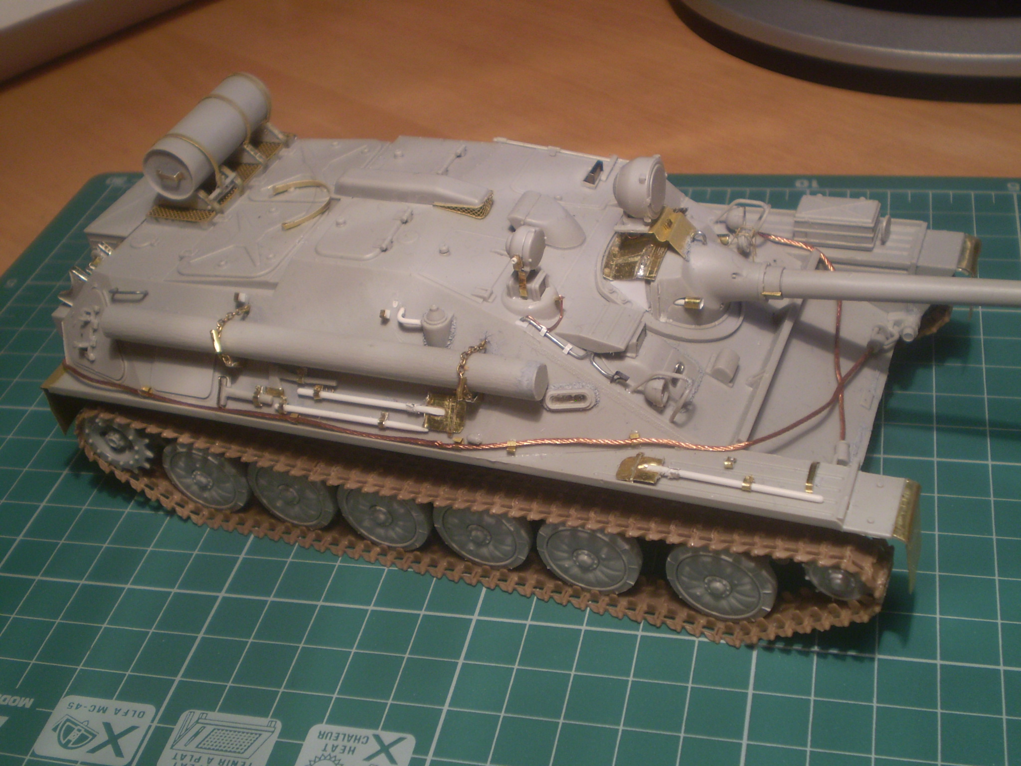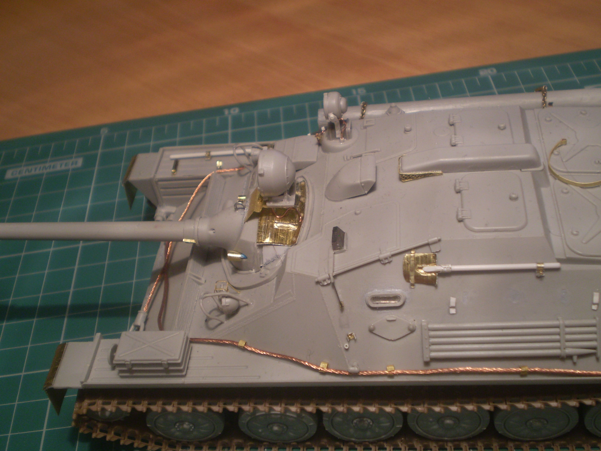 Собрал из коробки новинку от Трубача. В целом нормально, но есть непонятные моменты у китайцев: зачем было выдумывать бронировку маски орудия, когда нужно было на нее просто слепить чехол , причем крепления сделаны правильно а сама маска из области фантастики. Надеюсь в скором времени появятся точеные стволы с правильными масками. Без допнаборов решить проблему неправильных дымовых шашек не получится, хорошие БДШ-5 есть у Абера. Сварных швов мало, крепление осветителя на командирском смотровом приборе в топку, сами смотровые приборы по бортам не там где нужно, ну и так еще по мелочи всякое-разное.
