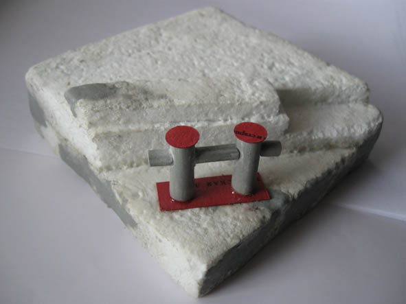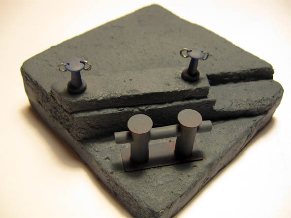 НЕ много промахнулся с поперечной планкой кнехта. Сишком высоко задрал(( Всё это выяснилось после его загрунтования и посадки на клей- начал "баловаться" с будущим канатом и- Оп-ля! тут то всё и всплыло...
