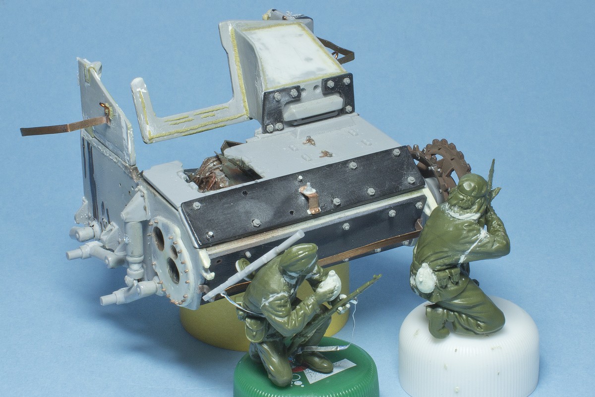 Omskiy Tankist, Так и планирую. Еще головы двух первых бойцов хочу повернуть, друг к другу - как бы разговаривают между собой. Как вариант, левому из них дать вторую винтовку, так как правы тащит патронные ящики от Максима. А танкисту хочу дать ДТ вместо "штатного от Танка" MP-40 - это более вероятное оружие в тех условиях