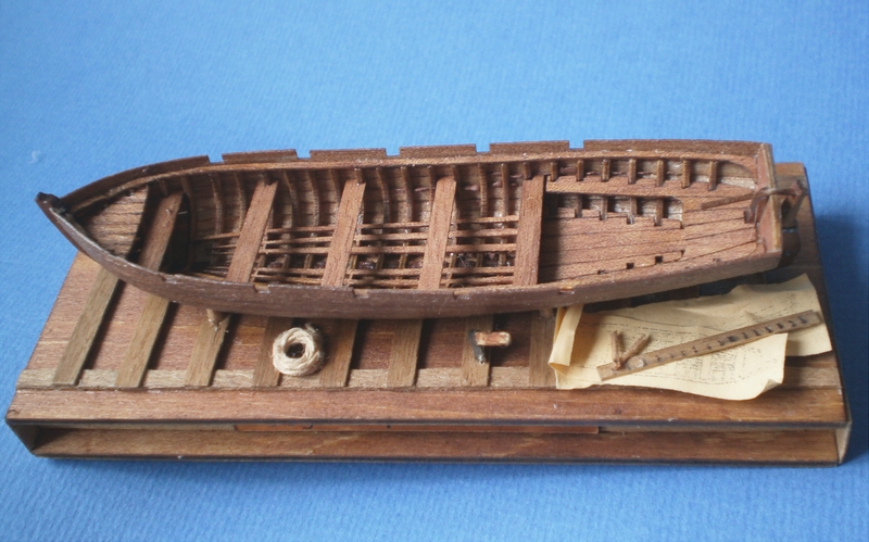 Куттер десятивесельный (позже название примет знакомую форму "катер") примерно конца 17 - начала 18 века. Подставка - имитация стапеля, из "стапеля" для сборки, бывшего в наборе. Дерево, вероятно, орех. Чертежи, измерительный и иные инструменты рядом - вот сейчас адмиралтейские чиновники будут принимать работу.