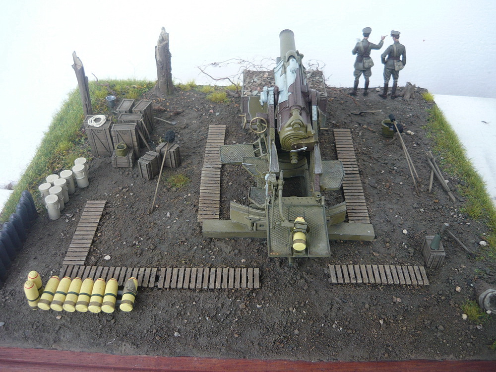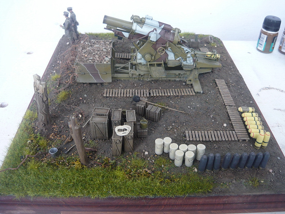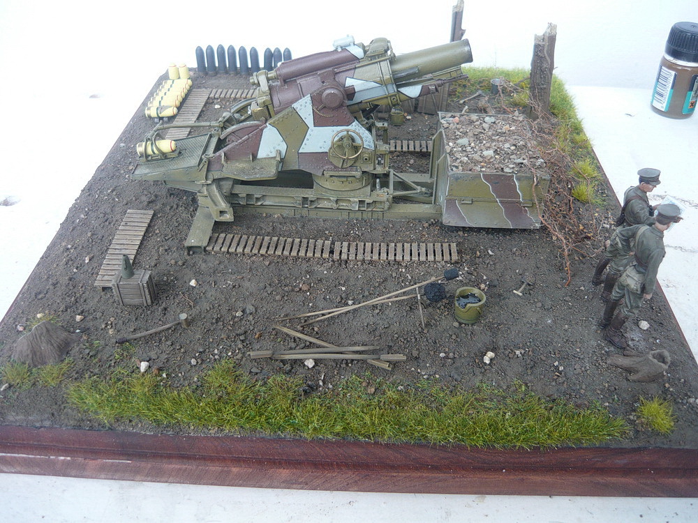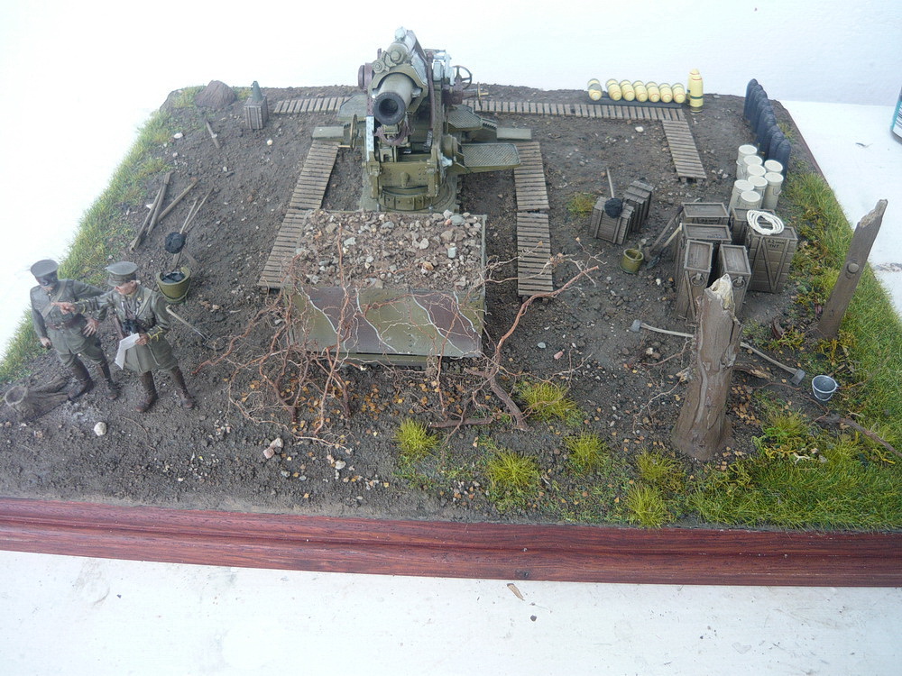 de_grivois у меня была возможность несколько дней покрутить всю композицию и по-расставлять все аксессуары. Композиция вся завязана в прямоугольник, сдвиг её по диагонали приводит к образованию пустот по краям. Вид получается какой-то кривой. Учитывая габариты диорамы 50*38 см добавлять ещё грунта тут только приводит к пустому увеличению площади диорамы и весу. Дуб как никак и строительной шпаклёвки тут много.