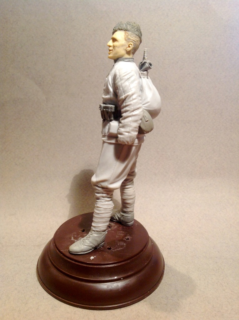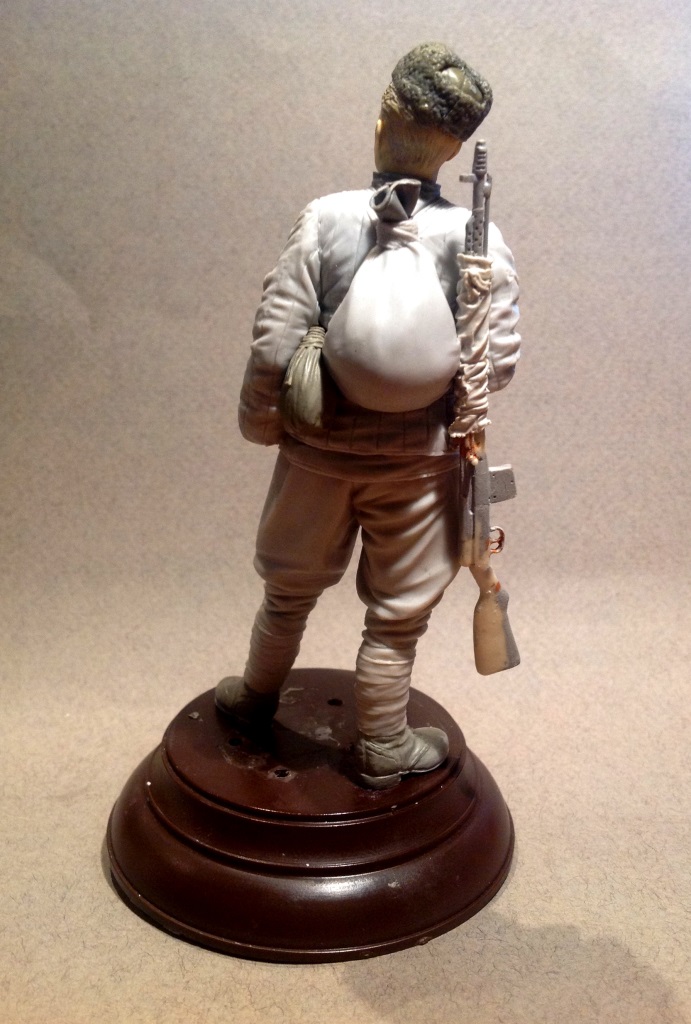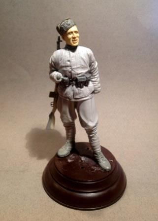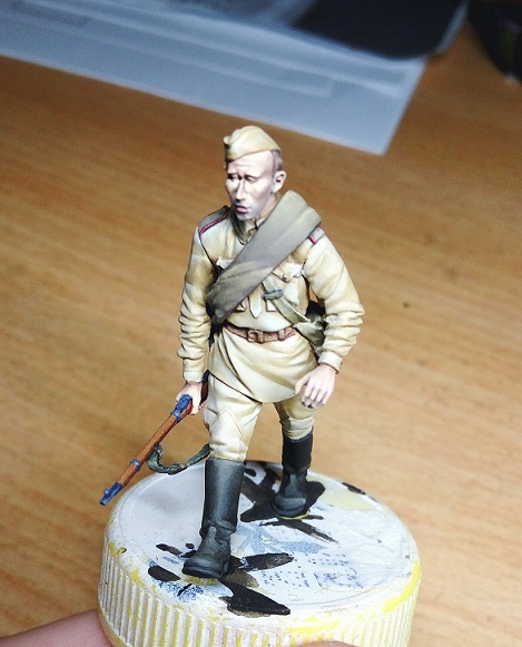 Вот такой боец лепится. Масштаб 1/16, термопластика, эпоксилин (ботинки, ремень, подсумки, горловина сидора, фляга и шапка). Голова из запасов, кажется, 5,45. Винтовка от Capitan, копийность на 3,5, качество на 2: множество пузырьков и каверн, смола очень хрупкая, настолько, что при отпиливании от литника поломалась. Пришлось её "обернуть", как снайперы делали. Боец в итоге определился в отряд снайперов. Прицел прицеплю позже, "ласточку", которой от крепился к винтовке, переделывать пришлось полностью, деталь абсолютно не копийна и не проработана при таком крупном масштабе.Жду критики)