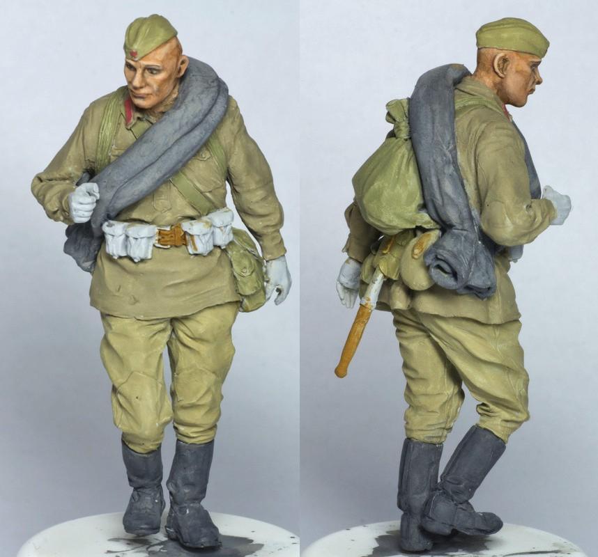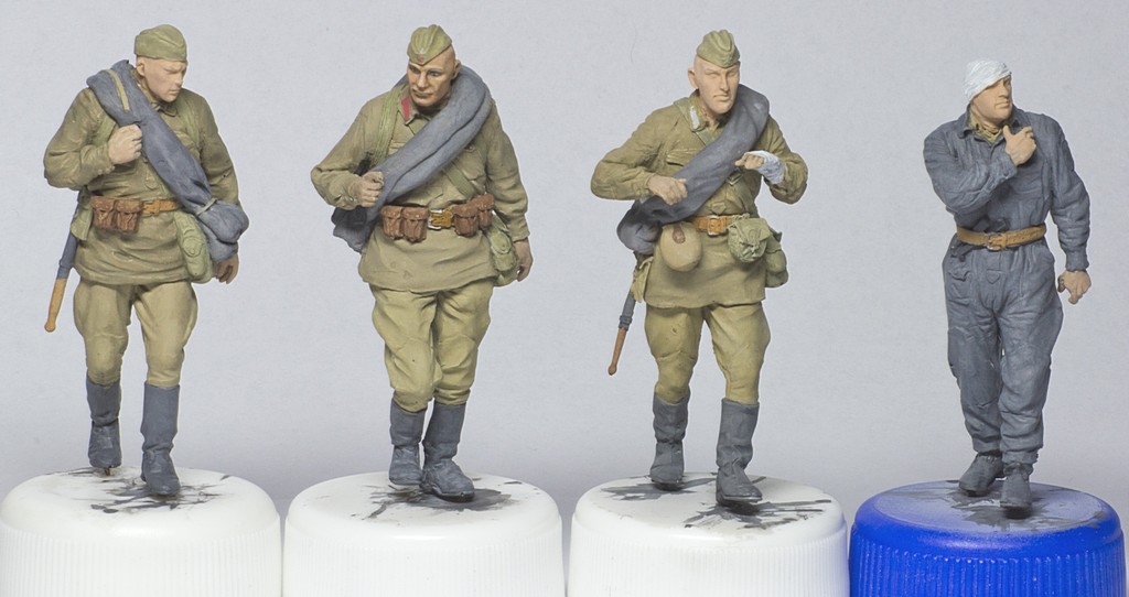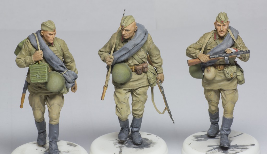 А добавите Вы туда вот эти, скажем так, достаточно посредственно покрашенные массово-тиражные фигурки, и сразу получится самая обычная диорама из разряда так всеми любимого штампа «Солдаты куда-то идут мимо подбитой техники».