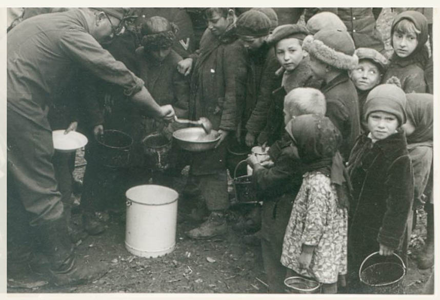 Этакая зарисовка первой или второй зимы на Восточном фронте. Немцы едят гуляш и к кухне на запах еды вышли несколько голодных детей из разрушенной деревни...