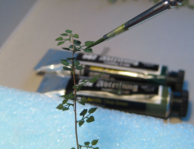 Следующим этапом, верхняя сторона каждого листа была покрашена более темным оттенком зеленого.