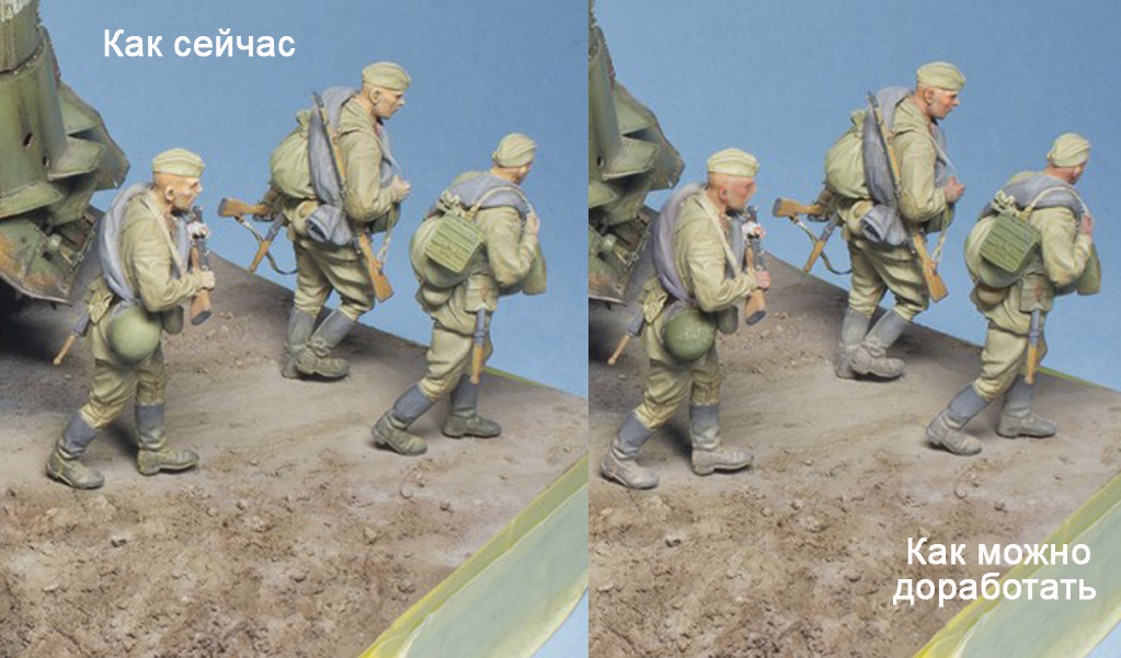 saleh, Добрый день, Андрей. Насколько я понял, ты расписываешь темперой, а с этой краской можно работать достаточно прозрачными слоями.У тебя МЕСТАМИ и в целом фигуры получились светлее и менее насыщены по цвету, чем надо, а это исправить легче, чем если бы они были перетемнены. Попробуй лессировки очень жидко разведенной краской (без белил!)как фильтр или смывка(например красный на лице или зеленый на амуниции). Главное - чтобы получался ровный ПРОЗРАЧНЫЙ красочный слой( менялся только ОБЩИЙ тон и цвет исправляемой поверхности, а предыдущие слои росписи с градацией тонов оставались видимыми, тогда не нужно будет переписывать все заново ). "Заливай" сразу всю поверхность, которую хочешь откорректировать по тону или цвету(например голову или лицо). Края заливки аккуратно растушевывай чистой кистью, чтобы не было видно границы между новым и предыдущим слоями. Там, где (например в углублениях) краски будет излишек, так же выбирай аккуратно сухой чистой кистью(лучше сразу запастись несколькими)- это НЕ ДОЛЖНО смотреться смывкой. Если все правильно получится сделать - в итоге лицо(или другой исправляемый участок) должен поменять тон или цвет (как от светового фильтра), но самого слоя краски не должно быть заметно. После полного высыхания первого слоя может понадобится доп.слой с другим оттенком цвета более локально или исправление некоторых участков. Белила в краску добавляй только в крайнем случае(в самом конце), если где то получится тон темнее нужного и по другому его исправить нельзя. Главное - смягчай края у новых слоев, чтобы они мягче входили в старую роспись и тебе не пришлось все переписывать заново. Попробуй сначала потренироваться на "кошках" - тут главное почувствовать степень разведения краски и то, насколько предыдущий слой позволят ровно положить на себя краску нового. Опять же, можно сначала поработать с аммуницией, а лица и кисти лессировать в последнюю очередь, когда наберешся опыта.