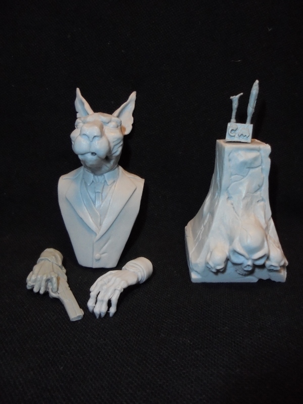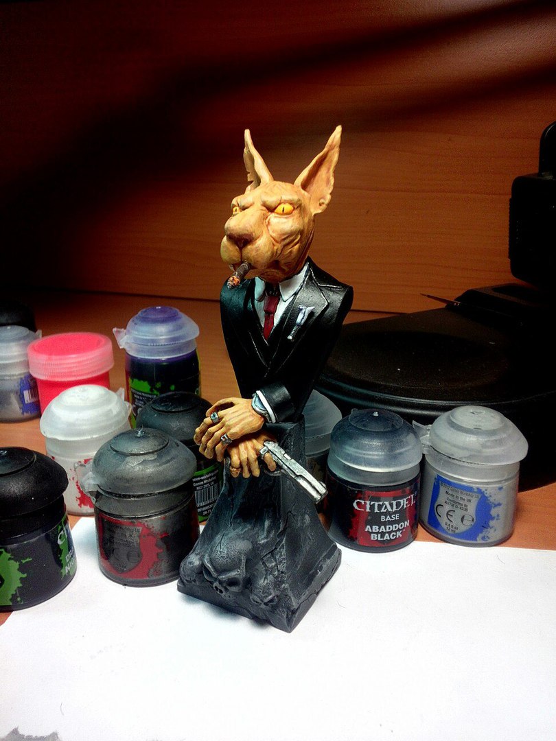Всем привет!Решил я не бежать впереди паровоза и потренироваться на чем-нибудь простом.Бюсты никогда не красил,поэтому не уверен,что с первого раза получится что-нибудь путное.Решил потренироваться на"кошечках".Взял для начала в работу вот такой вот бюстик 1:10 от"Garry M.":Я его назвал"Дон Котлеоне".После сборки должно получиться это:Тут нет каких-то сложных элементов,хотя с пистолетом и часами придется повозиться.Ну и ухи немножко потрепать,оборвать,не бывает таких гладких у кошек.