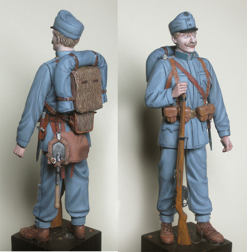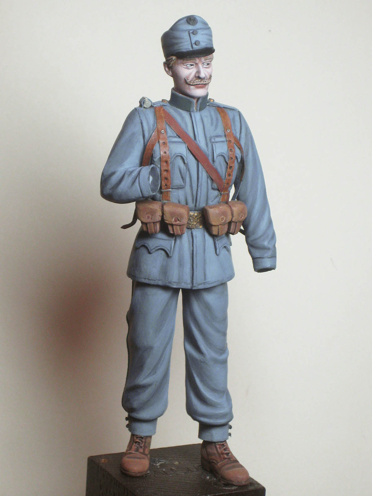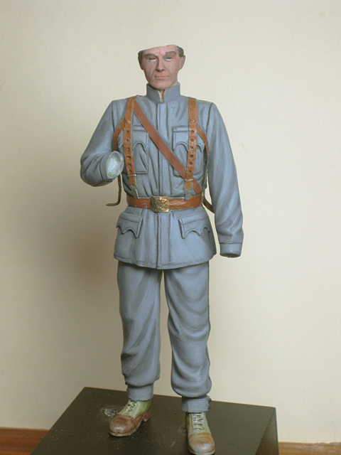 Увы, не смогу, они в 14-м такие вот коричневые (как и в Германии) были. Песочные намного позже, когда уже и покрой мундира другой стал (отложной воротник). Так, что у меня все жестко к 14 году привязано.Мож сухарку перекрасиш в песочный?А то какой то он совсем двухцветный получился.