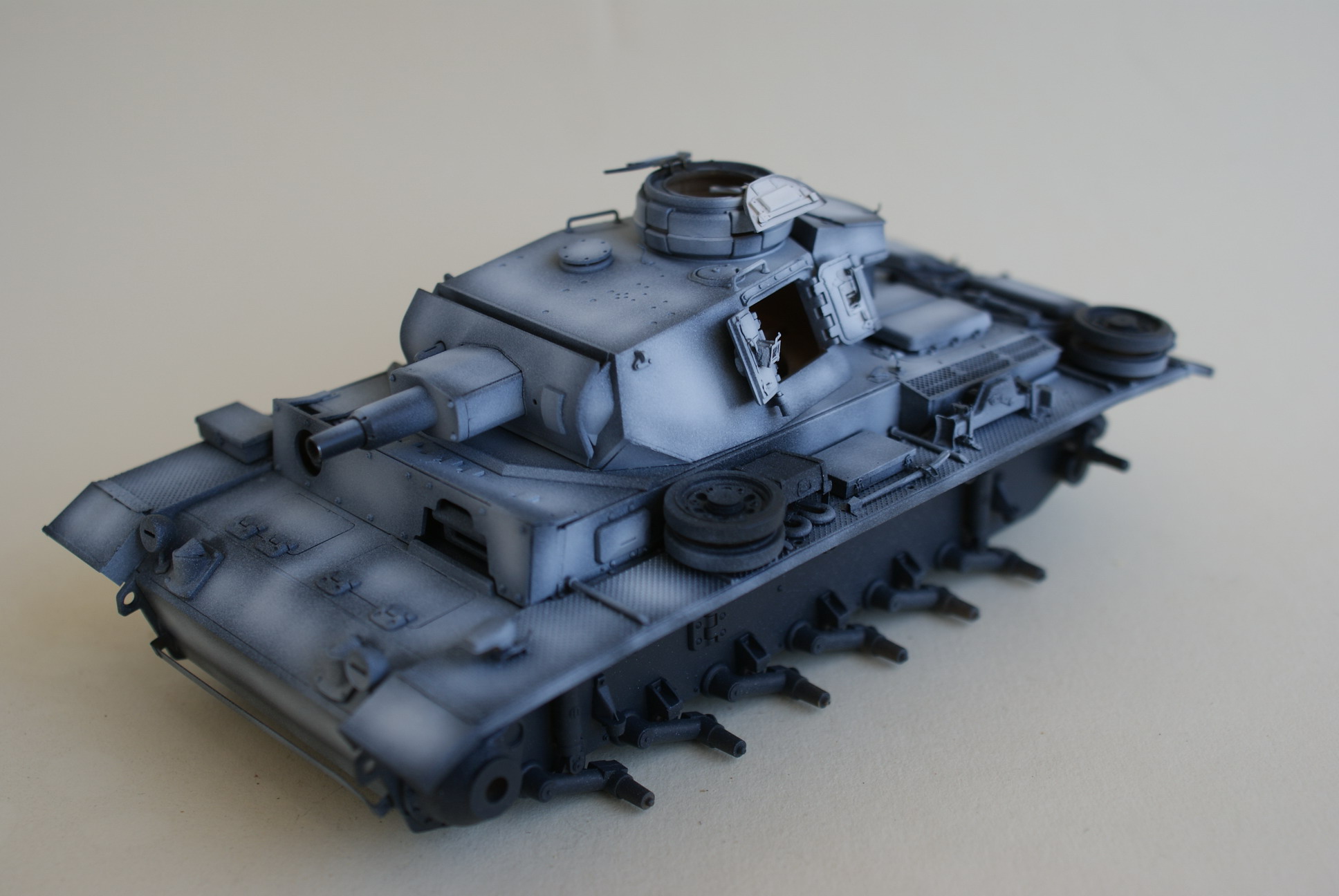 Прежде чем наносить белый, хочу поделится своими мыслями и сомнениями. Судя по подписи к исходному фото танк относился к 19-й танковой дивизии. На фото сильно не разберешь есть ли номер на башне. Вопрос - если делать номер - оставить его на фоне серого или поверх белого камуфляжа и какого он должен быть цвета? Тот же вопрос по эмблеме.
