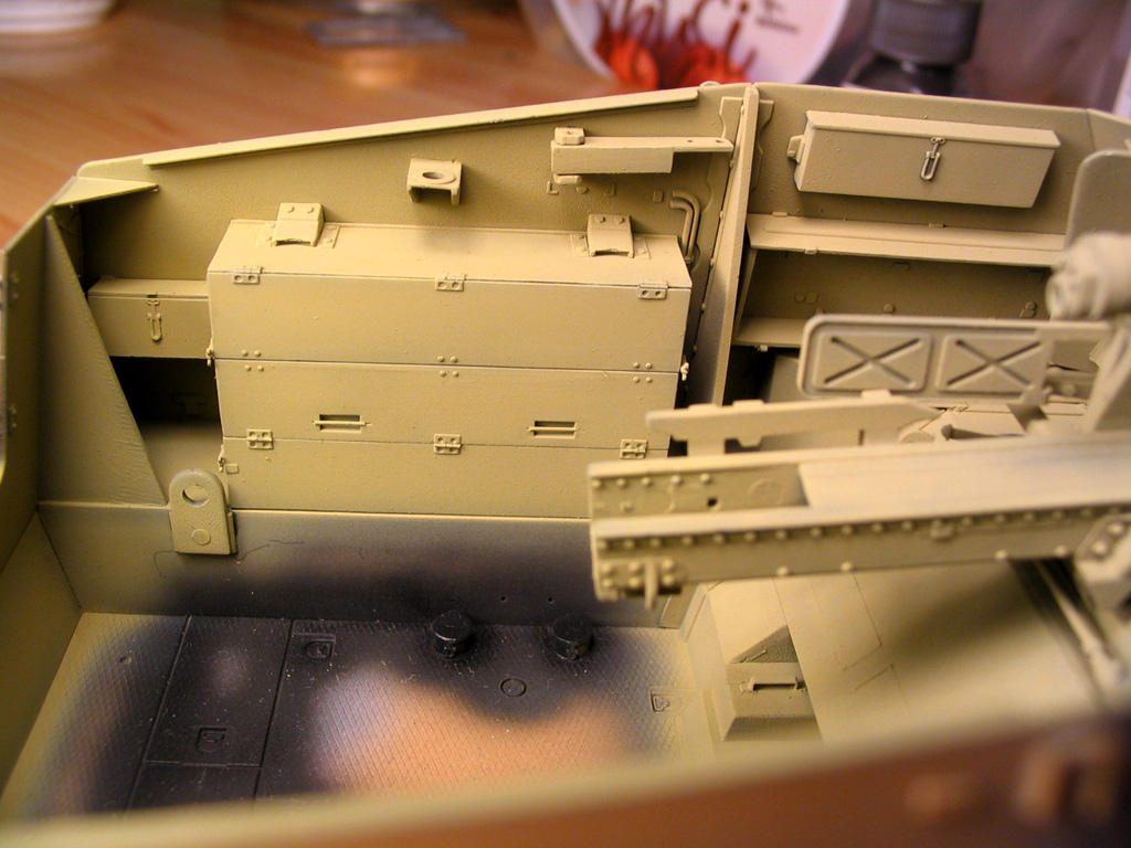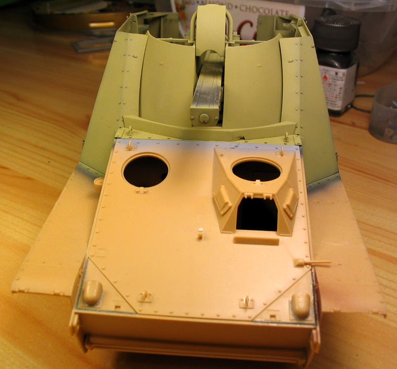 Немного продолжения. Итак удалось впихнуть лафет орудия на место, ничего не сломалось. Но между маской орудия и бортом получилась значительная щель. Складывается впечатление что орудие надо было подвинуть на 0,5-0,7мм вперед и оно бы встало идеально. Я теперь уже ничего не исправлю, но кто будет собирать эту модель , то самый простой способ здвинуть крышу над двигателем вперёд.