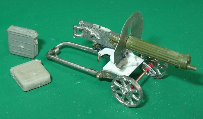 В запасе у меня было две модели пулемётов Максим, фирмы Звезда и из белого металл из Пензы. Ни один из них не ставился на станок. Ширина хода была великовата. ну и по мелочам. Проверил всё по чертежам и из деталей двух моделей, и частично сделанныз заново сделал свой Максим.С подвижными деталями. Сделал мастер модель пулемётной коробки и отформовал 12 шт.