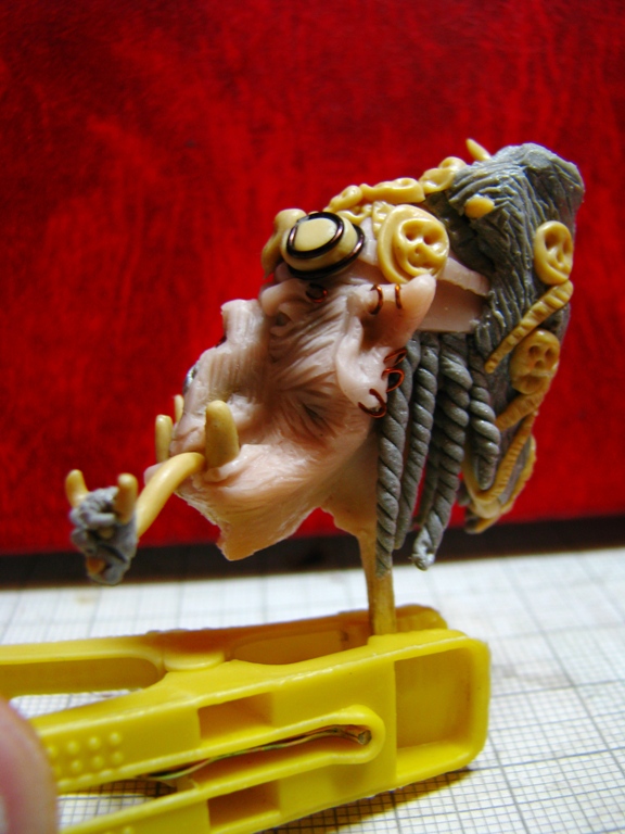 долепил гриву. добавил косички. немного черепов на прическе. лейкопластырь на морде. слева на скуле начал лепить шрамы- добавлю пару швов. стал напоминать главного злодея в гибсоновском апокалипсисе.