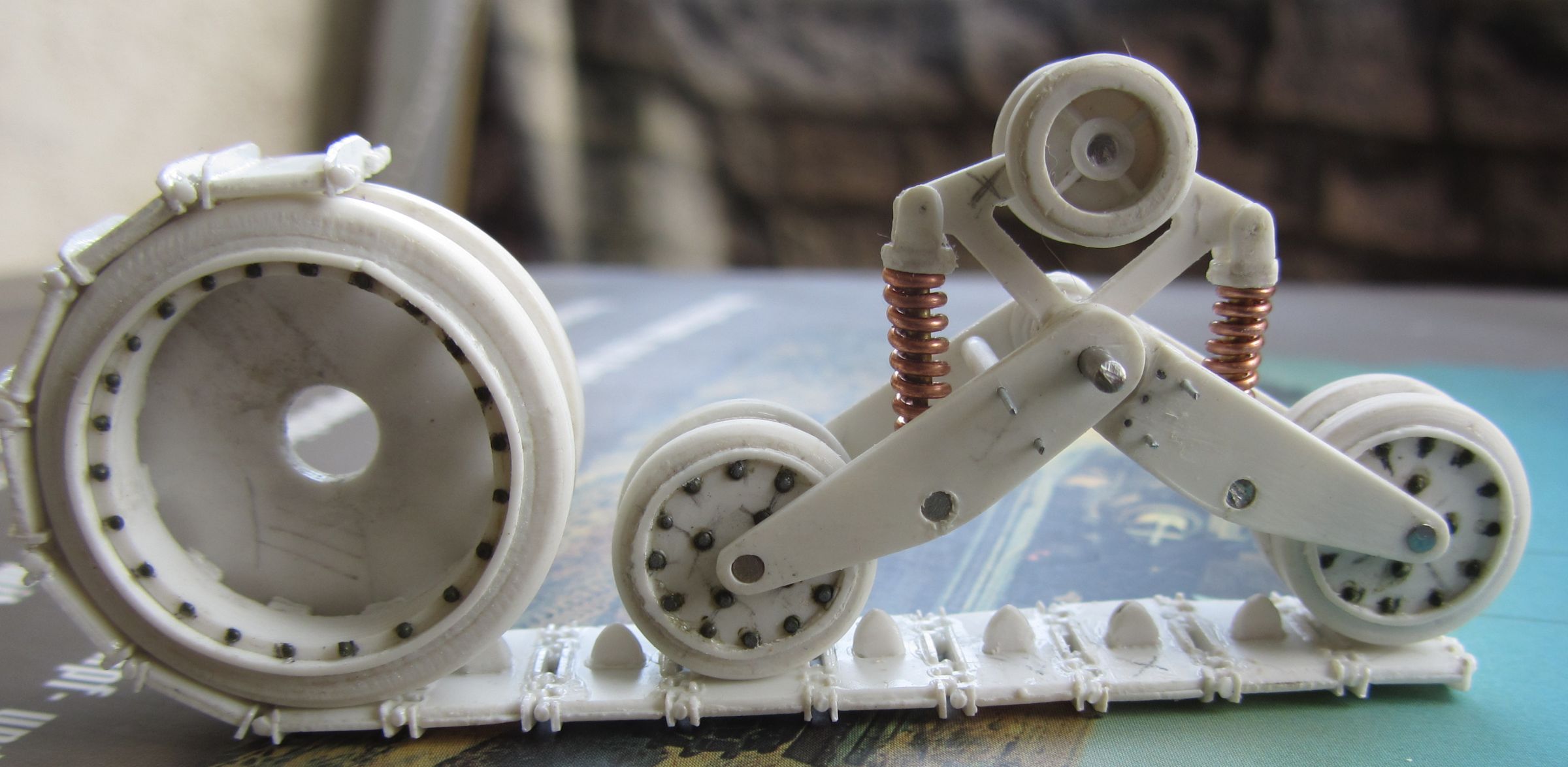 Итак, колёса и тележки полностью готовы, за исключением обвеса тележек - несколько лючков и болтов. Их буду делать потом, сперва тележку надо прикрепить к корпусу, и будет окончательно ясна ширина зазора (т.е. максимальная высота лючков и болтов).