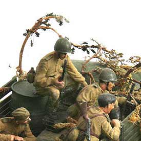 tankist, По листикам могу присоветовать простое: чуток каждый пинцетом помять (ну надо, а то они прямые как правда). А потом маслицем с тоном, чутка отличающимся от базового зеленого, пройтись кисточкой. В идеале несколько тонов, вплоть до ржы. Дуб - дерево крепкое, листья могет даже на зиму не сбрасывать, только ржавеют они от морозов, так что могли маскировочных кустов наломать с такими "ветеранами". Монотонность и уберется.