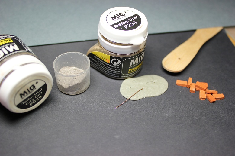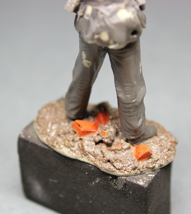 Подставку необходимо делать также до окраски фигурки, чтобы окончательно ее спозиционировать и не мучиться потом, ломая и "лапая" уже окрашенную фигуру. Подставочку от этой фигурки я использовал ранее, но не беда изготовить новую самостоятельно не составит труда. Используем как основу другую подставку и придадим ей доплнительный рельеф (можно просто любой кусок пластика подходящей толщиины). Чуть гипса и песка, кирпичики от MAD моделист, проволоку как остатки какой-нибудь арматуры. Пигменты не обязательны все равно потом грунтовать (если используете пигменты меньше вероятности что при повреждении основания не обнажиться белый гипс, к примеру при перевозке на выставку) Все бодяжим на клее ПВА. Для антуража бросим пустой диск от ППШ.