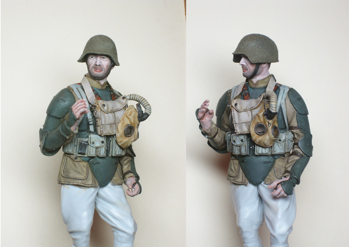 Первый минус (для меня лично)- голова отлита вместе с туловищем. Возможно это и не так уж страшно, но поскольку я за много лет привык красить голову всегда отдельно, то просто очень неудобно крутить в разных плоскостях всю фигурку, а не голову на зубочистке. Лицо к сожалению слишком замылено, с плохо выраженными глазами и рельефом, но это прототип такой был использован, он и в оригинале плох. Зато на лице уже сделана "щетина", так что без вариантов красить небритого придется. Если Павел будет выпускать второй тираж, то есть смысл поменять голову на более проработанную и нейтральную и делать ее отдельной деталью. Руки требуют небольшой подгонки, шпаклевки потребуется минимум.