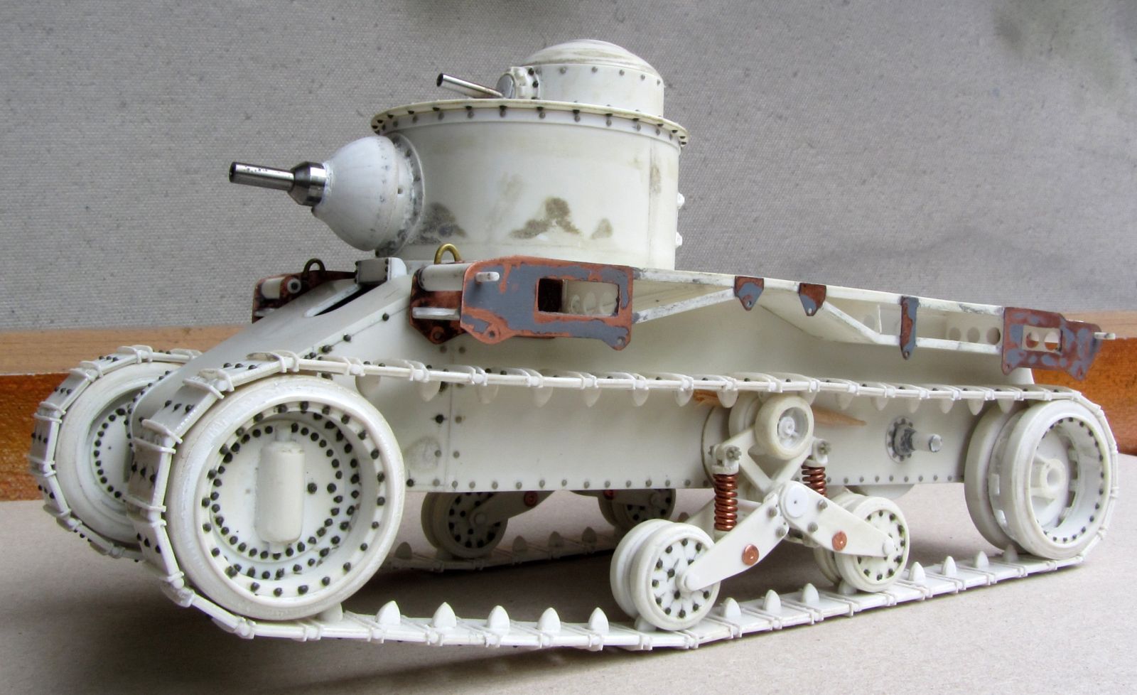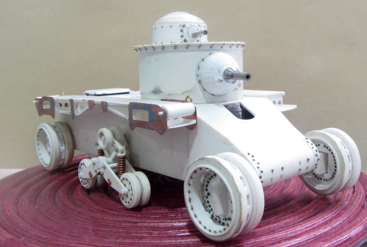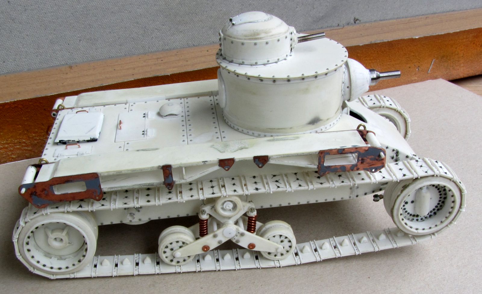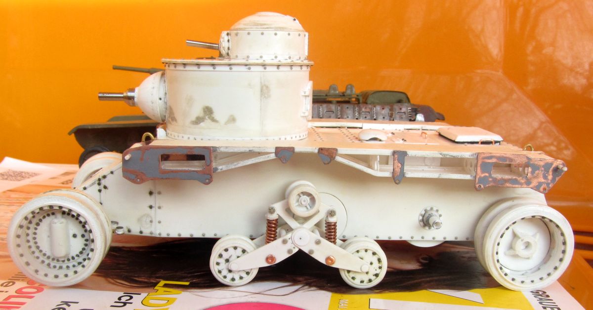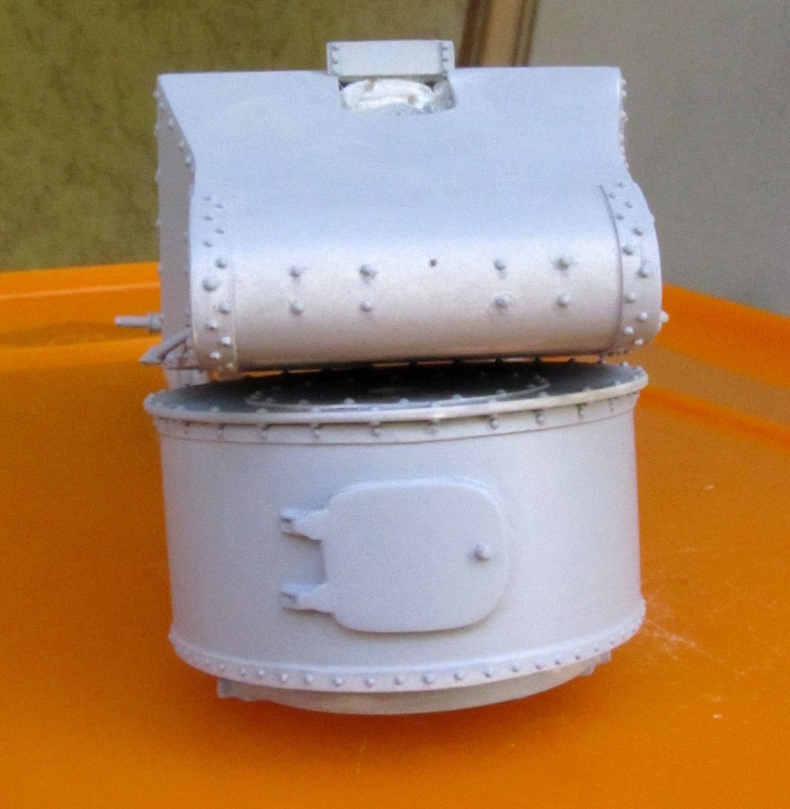 Не знал что делать, подумывал уже сделать башню заново, потом попробовал снять грунт всякой химией. Получилось, но снялся ВЕСЬ грунт. И я каждый день в течении полутора недель грунтовал на ночь башню, утром точил, приходил с работы снова точил, мыл и так далее. Вроде как вышло нормально.